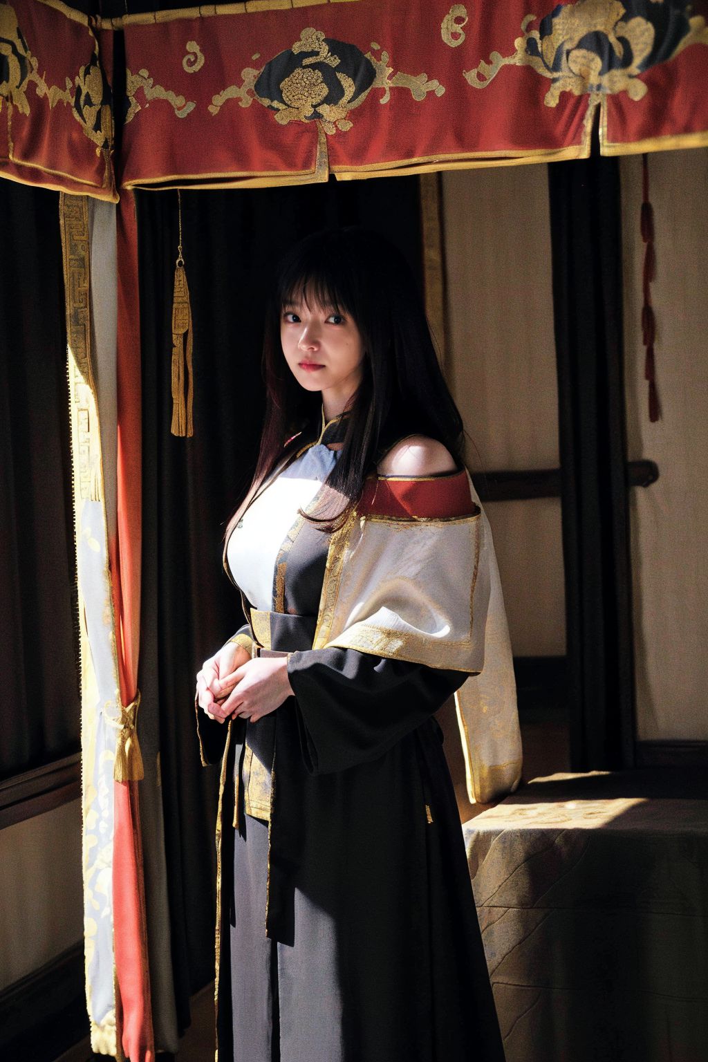 KyokofukadaIn the heart of a dimly lit room, a woman stands with an air of quiet elegance. Her attire is a striking contrast to the subdued surroundings - a long black coat that reaches down to her ankles, adorned with accents of red and gold. The high collar of the jacket adds a touch of sophistication.She is positioned in front of a window, its presence suggested by a curtain bearing red and gold designs that echo the colors on her outfit. A yellow lantern hangs above the window, casting a warm glow that softens the shadows and illuminates the scene.The womans stance is poised and confident, with one hand resting on her hip and the other lightly touching the curtain. Her gaze is directed off to the side, lending an air of contemplation to the image. The precise positioning of each element in this scene creates a harmonious balance, from the womans placement in front of the window to the careful arrangement of colors and objects within the room.