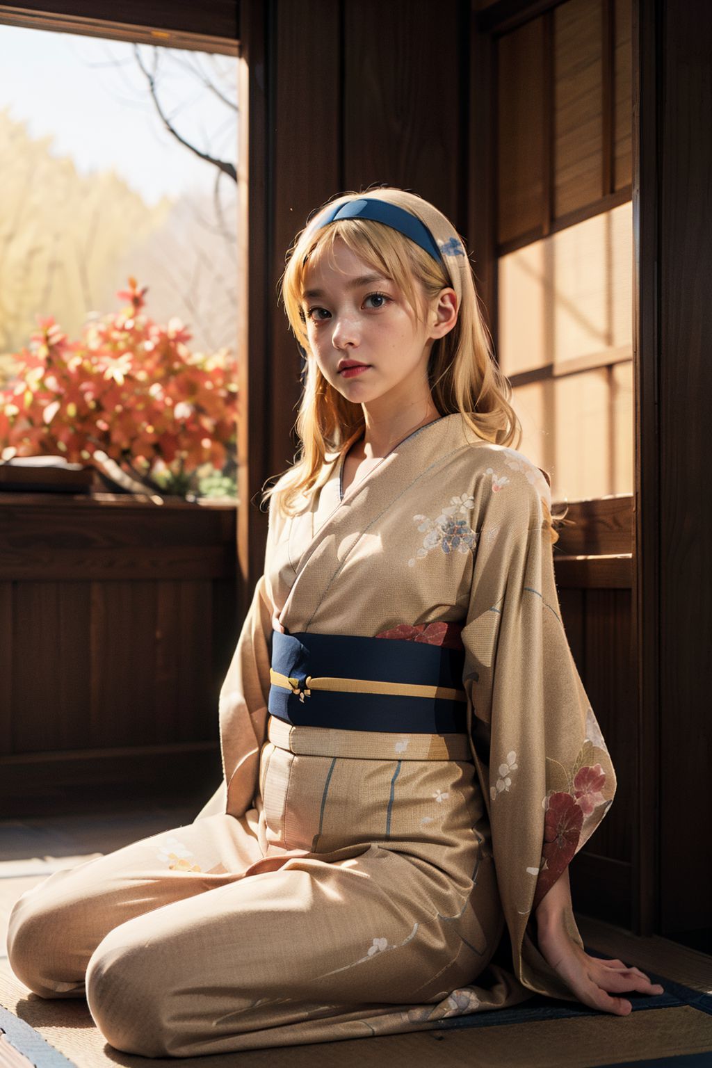 Aleksandra Pokryshkin Brave WitchesIn the center of the image, a young woman is seated on a wooden floor. Shes wearing a traditional Japanese kimono thats predominantly beige with gold accents, and a blue obi tied around her waist. Her hair is styled in loose waves, cascading down to frame her face.Behind her, theres a wooden structure with a window, providing a rustic backdrop to the scene. Through this window, you can see trees standing tall outside, their leaves a vibrant green against the sky.The womans gaze is directed off into the distance, suggesting shes lost in thought or perhaps admiring the view from the window. Her relaxed posture and thoughtful expression create an atmosphere of tranquility and introspection. There are no texts or other discernible objects in the image. The relative positions of the objects remain constant with the woman in the foreground and the window with trees in the background.