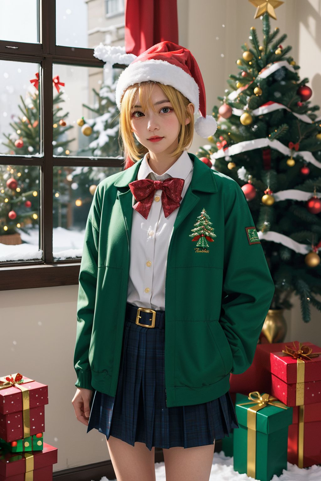 Ijichi Nijika Bocchi the Rock,In the image, a young girl is standing in front of a Christmas tree. She is wearing a green jacket adorned with a gold badge on the left chest, and her outfit is completed with a red bow tie. The Christmas tree behind her is decorated with ornaments in shades of gold and red. The background features a window that provides a glimpse of a building outside. On either side of the girl, there are two present boxes - one red and one green, each embellished with gold ribbons. The girls position between these boxes creates a balanced composition within the frame.