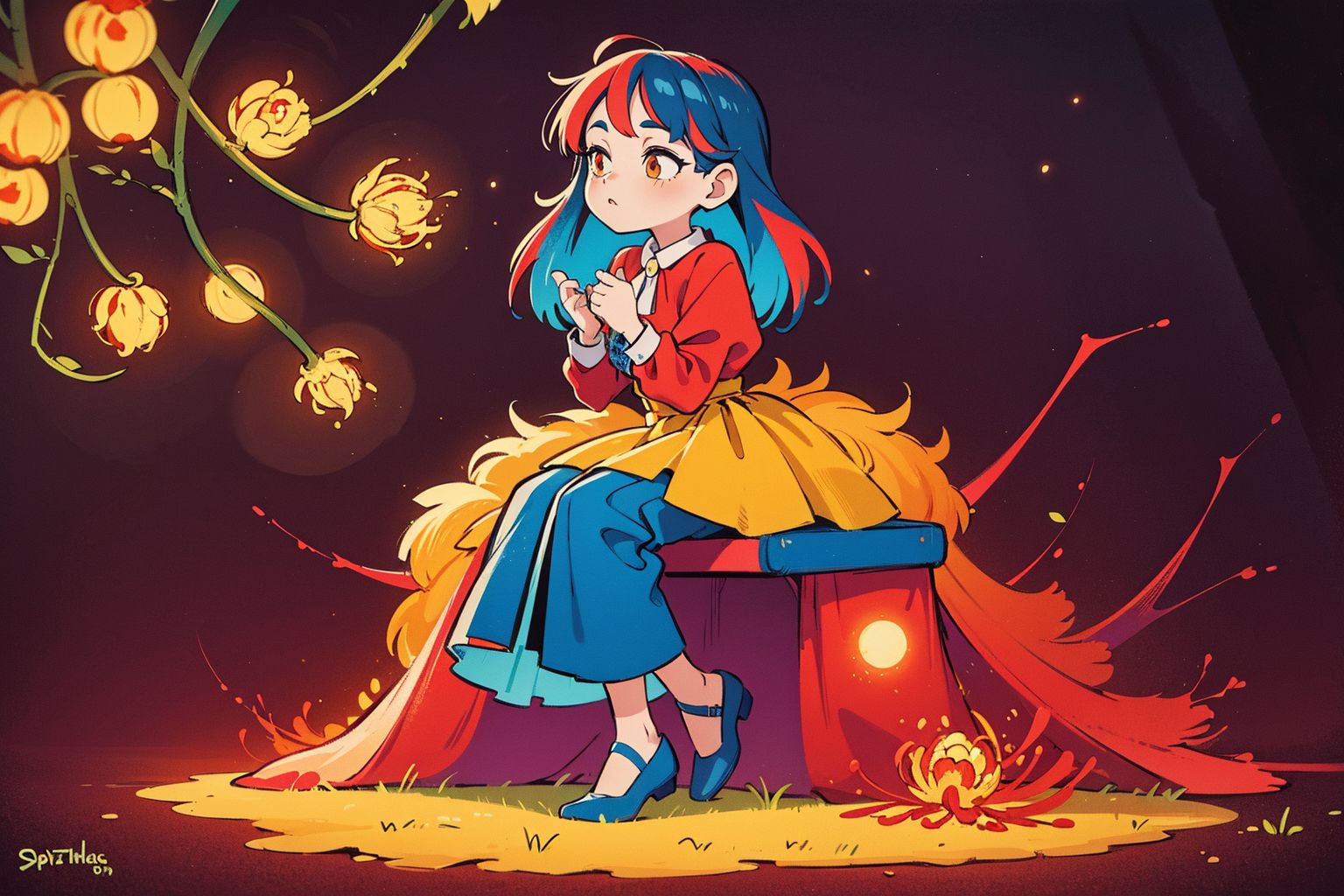 Polychrome,In the center of the image, a young girl with vibrant blue hair and a pink dress is seated on a red bench. She holds a yellow flower delicately in her hands. The bench is adorned with a red rose on its right side. In the background, a tree filled with orange flowers stretches upwards, illuminated by yellow lights that cast an enchanting glow over the scene. The entire image exudes a sense of tranquility and innocence.