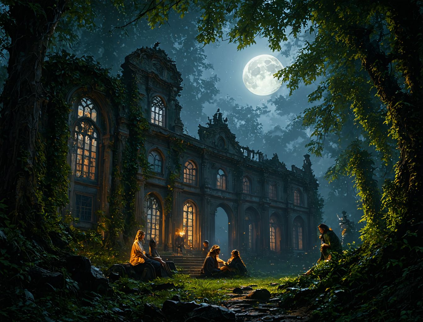 Fairy Tale House,In the given image, a group of people are gathered in front of an old stone building under a full moon. The building, showing signs of age and weathering, has three arched windows on the ground floor and one above it. Two additional arched windows can be seen on the second floor, but their details are obscured by the darkness.The building is nestled amidst trees and bushes, adding to its rustic charm. The people in the image are silhouetted against the moonlit backdrop, creating a striking contrast between the dark figures and the bright moonlight.In the center of the group, two individuals stand out from the rest as they hold up their hands towards the moon, perhaps in celebration or prayer. Their actions suggest a communal gathering or event taking place under the moons glow. The precise positioning of these individuals and their interaction with the moon is the focal point of this image.Overall, the image captures a serene moment of people coming together under the light of the full moon, set against the backdrop of an old stone building in a natural setting.