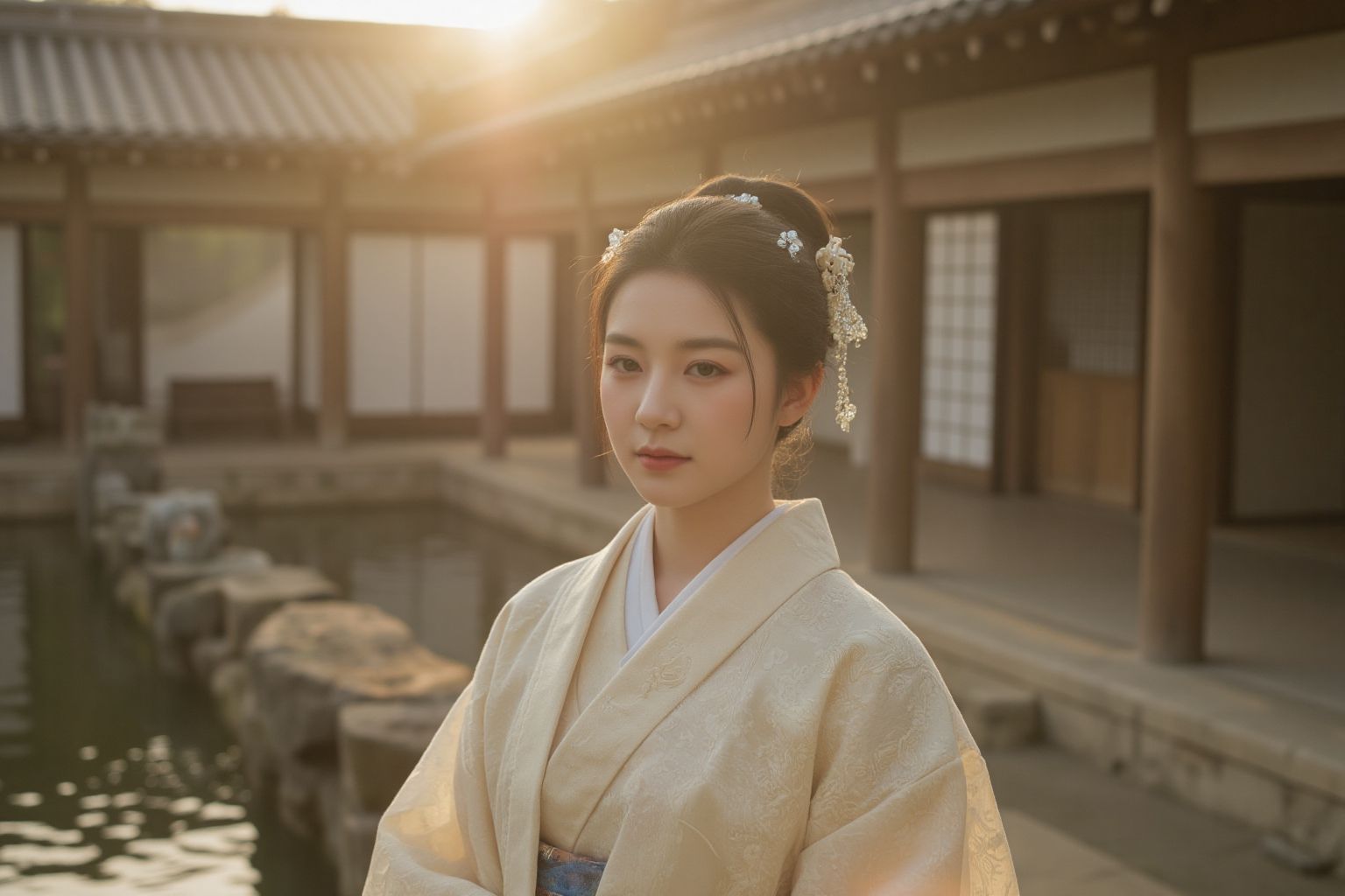 Ancient Chinese,In the image, a young woman is the central figure, standing in front of a traditional Korean temple. She is dressed in a white hanbok, which contrasts with her blue hair clip and the warm orange glow of the setting sun behind her. The temple, made of wood, features an ornate roof that adds to its cultural significance. A pond can be seen in the background, reflecting the colors of the sky. The womans gaze is directed off to the side, suggesting she might be deep in thought or perhaps observing something out of frame. There are no discernible texts in the image. The overall composition suggests a serene and peaceful setting, possibly during a significant cultural event given the traditional attire and location.