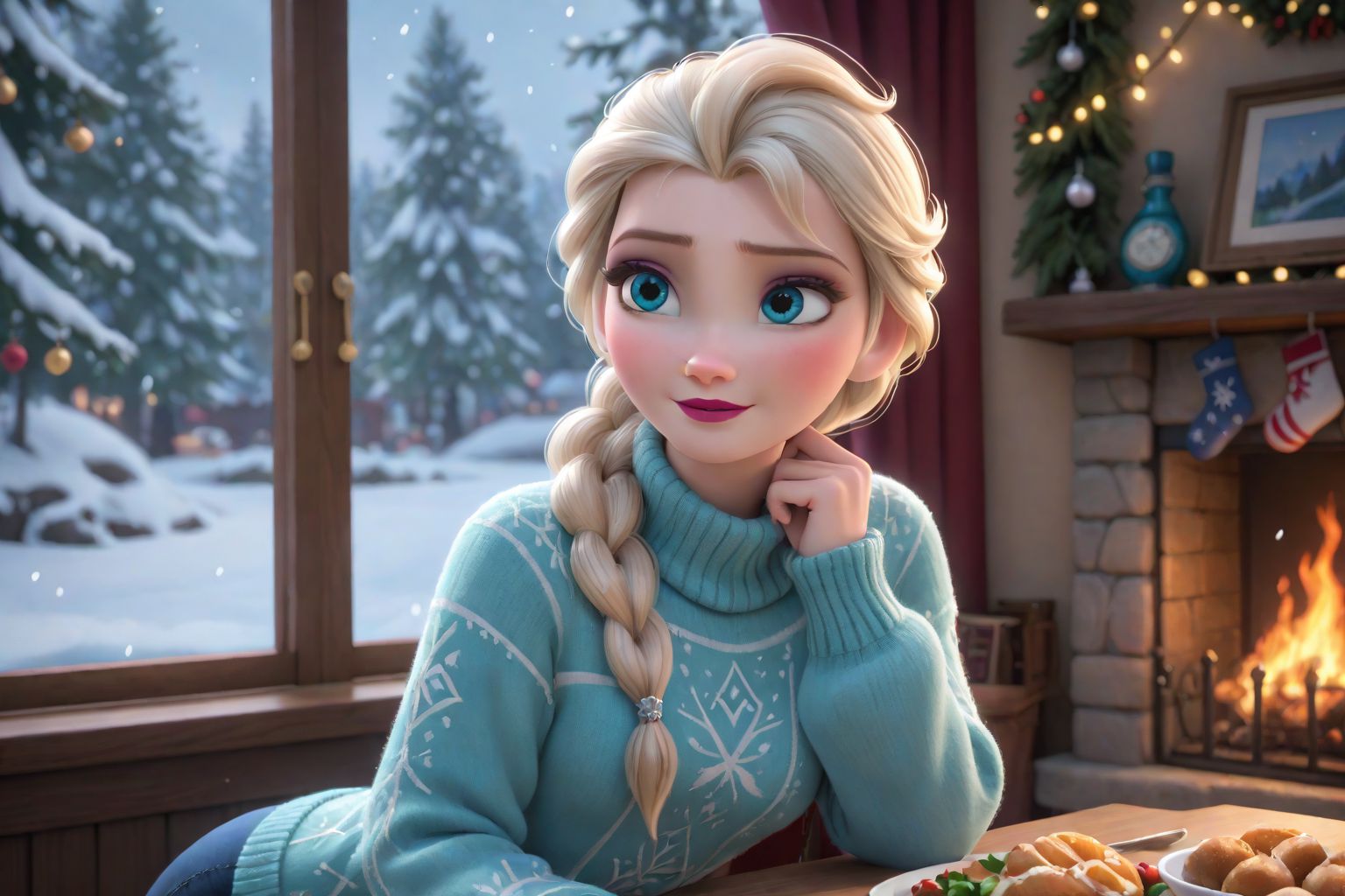 Frozen cozy elsa,In the heart of a cozy living room, Elsa, the beloved Disney princess from Frozen, is captured in a moment of quiet reflection. Shes seated at a sturdy wooden table, her fingers thoughtfully resting on her chin. Her attire, a vibrant blue sweater adorned with white snowflakes, matches the cool hue of her eyes.The room around her speaks of holiday spirit. A fireplace crackles warmly to one side, its dancing flames casting a soft glow that dances in Elsas hair. Above it, Christmas lights twinkle like stars brought down from the sky, adding a touch of magic to the scene.Outside the window, snowflakes gently fall, their delicate forms catching the light and creating a beautiful pattern on the glass. Its a serene winter scene, perfectly framed by the window behind Elsa.Every object in this image has its place, contributing to the overall narrative. Elsa, the fireplace, Christmas lights, and falling snowflakes all come together to paint a picture of a peaceful moment in time, filled with warmth and joy.