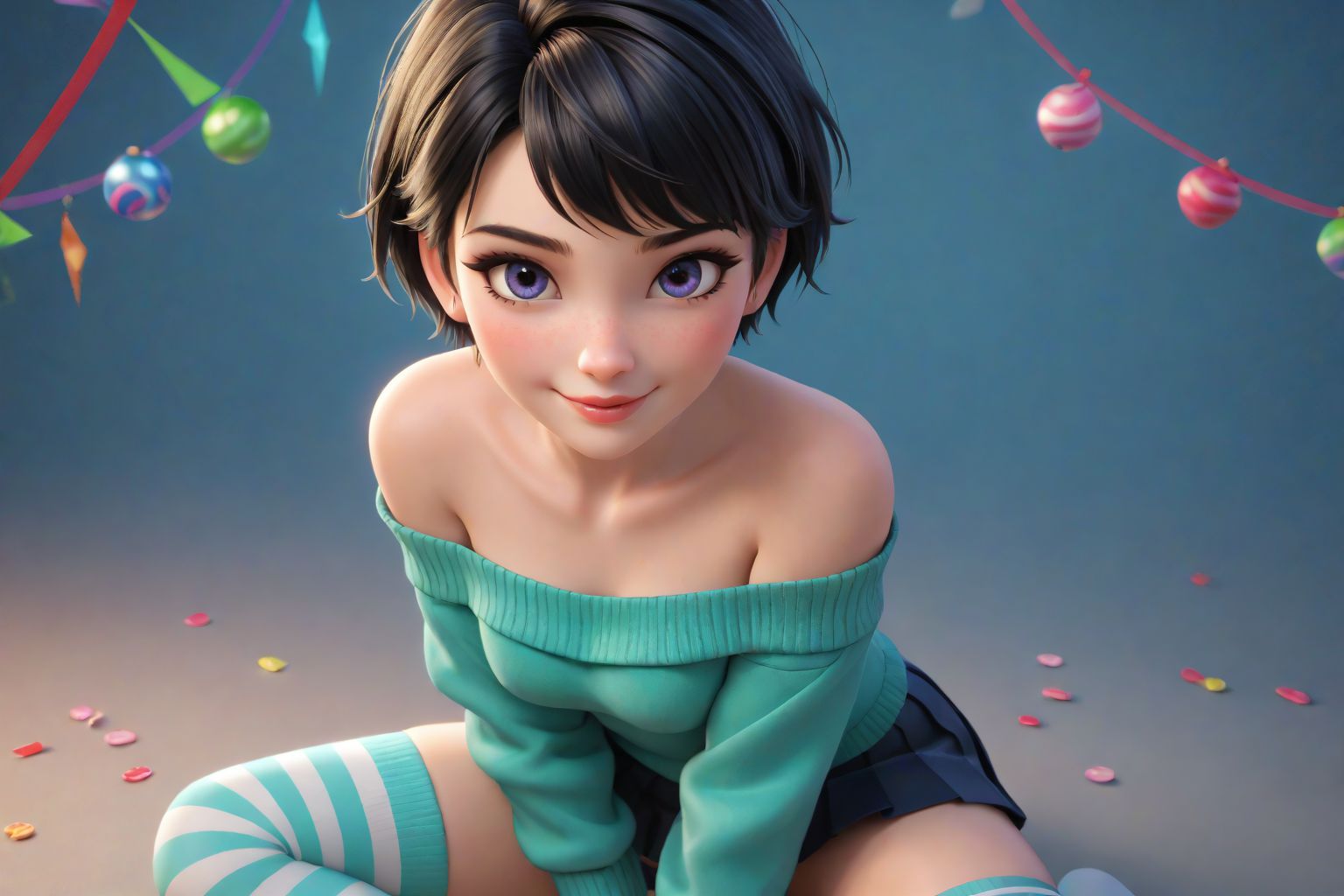 Vanellope von Schweetz,Wreck-It Ralph,In the center of the image, a young girl with black hair is seated on the ground. Shes wearing a green sweater and blue socks adorned with white stripes. Her gaze is directed off to the side, suggesting shes lost in thought or perhaps observing something out of frame.The backdrop to this scene is a vibrant blue sky dotted with fluffy clouds, creating a sense of tranquility. Scattered across this canvas are colorful balls, adding a playful element to the image. On either side of the girl, strings of rainbow-colored flags stretch upwards, their ends disappearing into the top left and right corners of the image. These elements collectively create a whimsical atmosphere around the girl.Despite the various elements present, the image does not contain any discernible text or significant actions being performed by the objects within it. The relative positions of the objects remain constant - the girl in the center, the colorful balls beneath her, and the rainbow-colored flags on either side. This detailed description is based on the visible content of the image and does not include any speculative or imaginary elements.