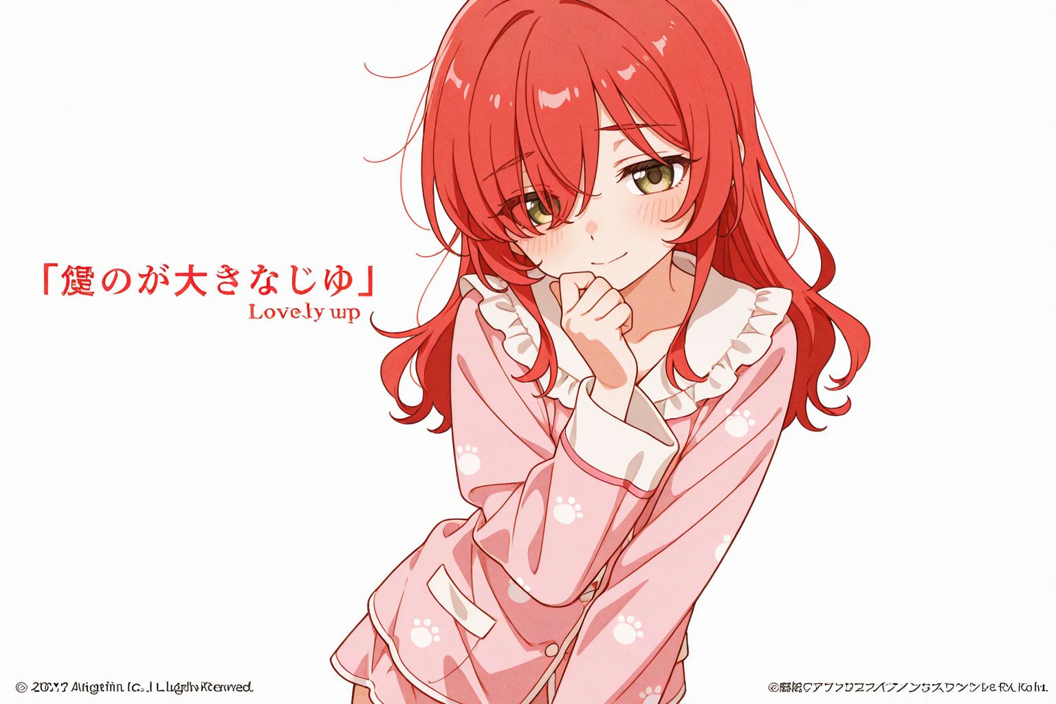 kita,In the center of a white background, a young girl with vibrant red hair and matching pink pajamas is captured. Her gaze is directed off to the side, suggesting she might be deep in thought or perhaps lost in a daydream. A delicate touch of color graces her cheeks as she blushes softly. The image exudes a sense of tranquility and innocence.On the top left corner, Japanese text stands out against the stark white backdrop. It reads ???艾?, which translates to I love you. This phrase, combined with the girls thoughtful expression and the affectionate tone of her outfit choice, paints a picture of youthful vulnerability and sentimentality. The image seems to be an intimate snapshot of a moment in time, a glimpse into the heart of this young girl.