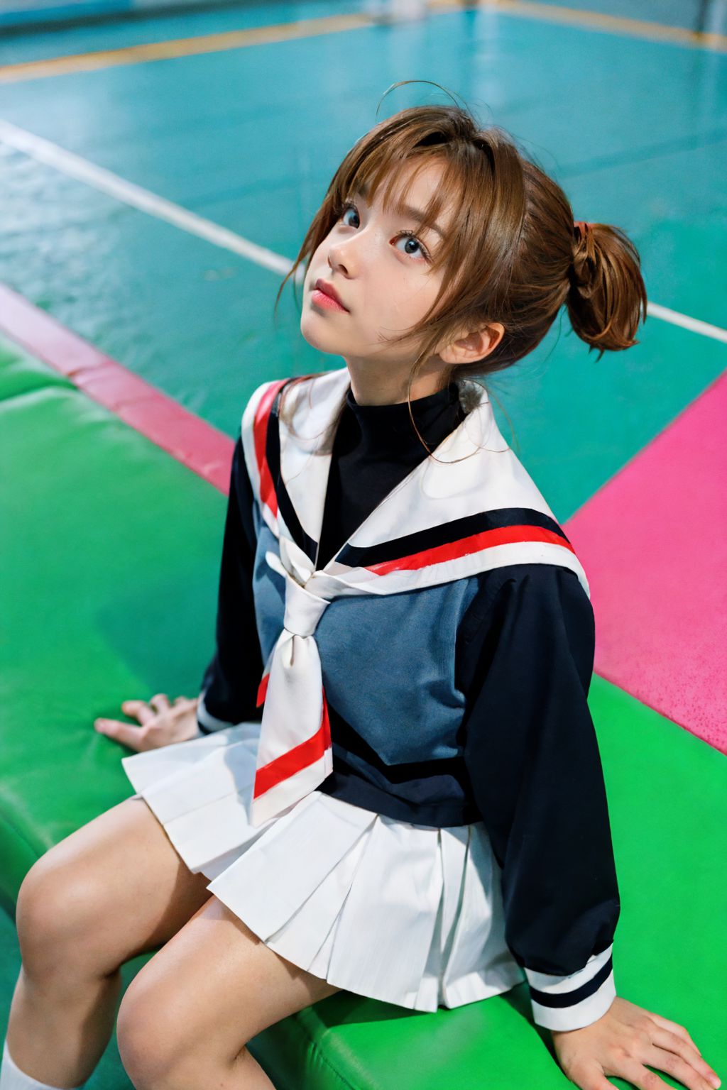 Nelvana of the series,Sakura Avalon,In the center of a vibrant indoor sports court, a young girl with dark hair styled in a bun is seated on a green bench. Shes dressed in a school uniform that consists of a blue and white striped shirt, paired with a white skirt. The bench is situated near the edge of the court, which features a distinct red line marking its boundary.The girl appears to be in deep thought, her gaze directed off into the distance and her expression serious. Her posture suggests shes in a moment of contemplation or perhaps waiting for something or someone.The sports court itself is devoid of any other people or objects, placing our young subject as the sole focus of this image. The green bench on which she sits contrasts with the red line of the court, further emphasizing her presence within the scene.Overall, this image captures a quiet moment in an otherwise active setting, offering a glimpse into the girls world amidst the hustle and bustle of sports court activities.