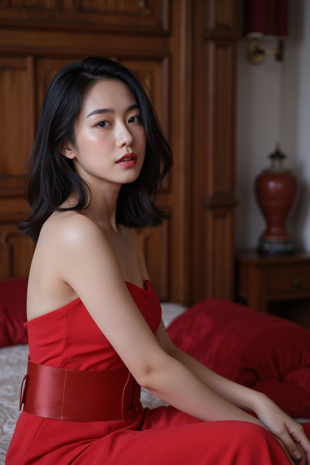 kimono,In the center of the image, a young woman with shoulder-length black hair is captured in a moment of quiet contemplation. Shes dressed in a vibrant red dress that stands out against the rooms neutral tones. The dress features a sweetheart neckline and thin straps, adding an element of elegance to her appearance.Shes seated on a bed adorned with a white comforter, which contrasts beautifully with the red pillow she holds in her left hand. Her gaze is directed off to the side, suggesting she might be lost in thought or perhaps observing something outside the frame.The room around her is furnished with wooden furniture, lending a warm and cozy atmosphere to the scene. A lamp on a nightstand stands out due to its red shade, echoing the color of the womans dress and creating a sense of harmony in the image. The precise positioning of these objects suggests careful arrangement, perhaps for a photoshoot or an intimate moment captured by someone who knows her well.