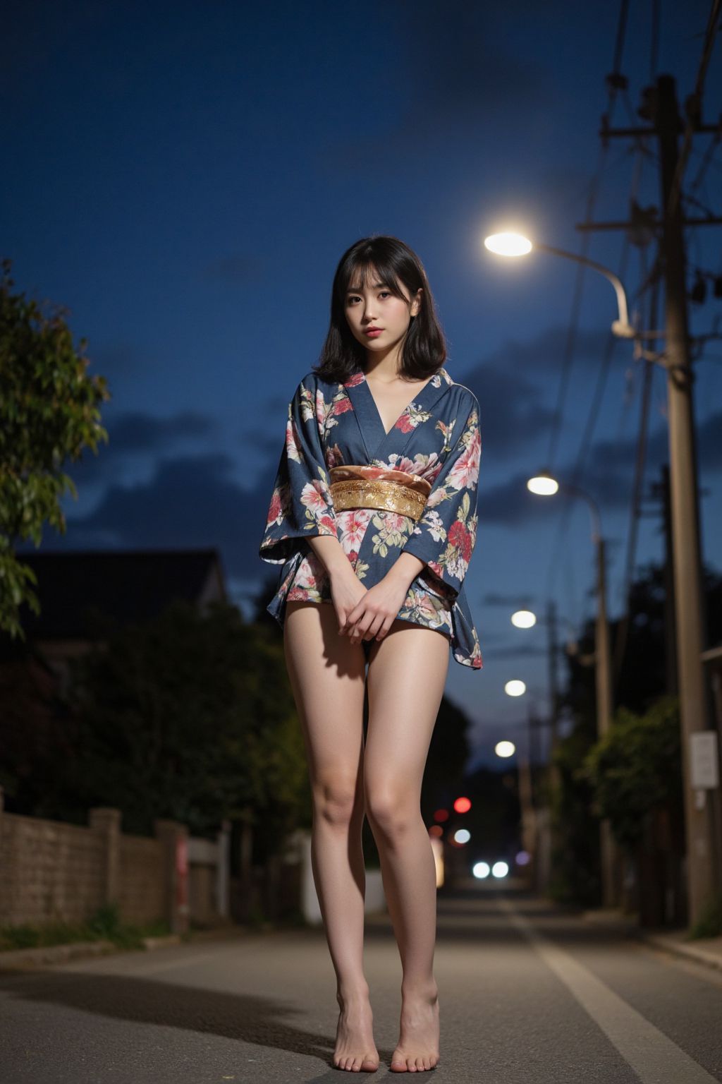 kimono,In the image, a young woman is captured in a moment of quiet reflection on a street at night. She stands on the right side of the frame, her body oriented towards us but her head turned to one side, as if lost in thought. Her attire is casual yet vibrant - shes dressed in a blue and white patterned dress adorned with red flowers, cinched at the waist with a yellow belt. Her feet are bare, adding an air of informality to her ensemble.The street on which she stands is lined with power lines that crisscross above her head, creating a geometric contrast against the soft darkness of the night sky. A solitary lamppost stands on the left side of the frame, its light diffused and unseen in this captured moment. The absence of other people or objects lends an air of solitude to the scene.Despite the darkness, the image is rich with detail - from the intricate patterns on her dress to the individual lines in the power grid above her. Its a snapshot of a solitary moment, frozen in time.