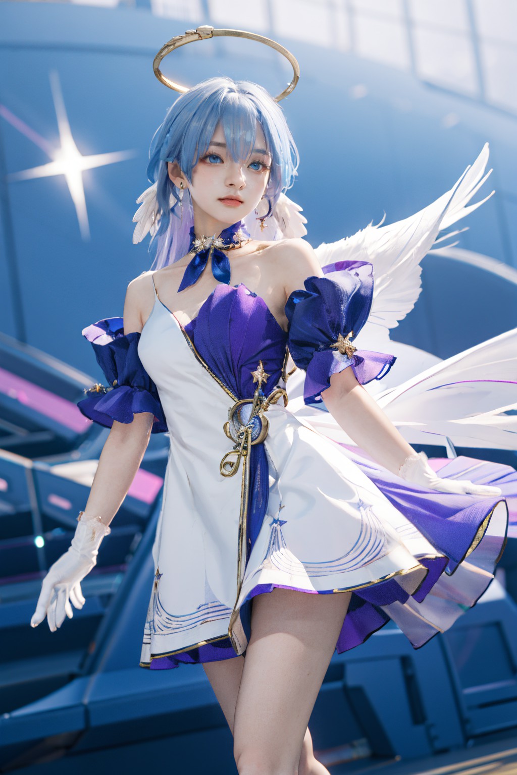 Honkai Star Rail,Robin,In the image, a young girl is captured mid-stride on a blue bridge. Shes donned in an enchanting ensemble of a white and purple dress, which stands out against the backdrop of a castle-like building. The dress is adorned with gold accents that add a touch of elegance to her outfit.Her hair, dyed a vibrant shade of blue, matches perfectly with her wings, creating a harmonious look. Shes also wearing an angelic halo made of white feathers around her head, adding to the ethereal quality of her appearance.The girl is looking off into the distance, giving us a side profile view that showcases the details of her outfit and surroundings. The background features a castle-like building with blue accents, mirroring the color scheme of the girls dress and wings.Overall, the image captures a moment of serene beauty, with the young girl in her angelic attire being the focal point against a picturesque backdrop.