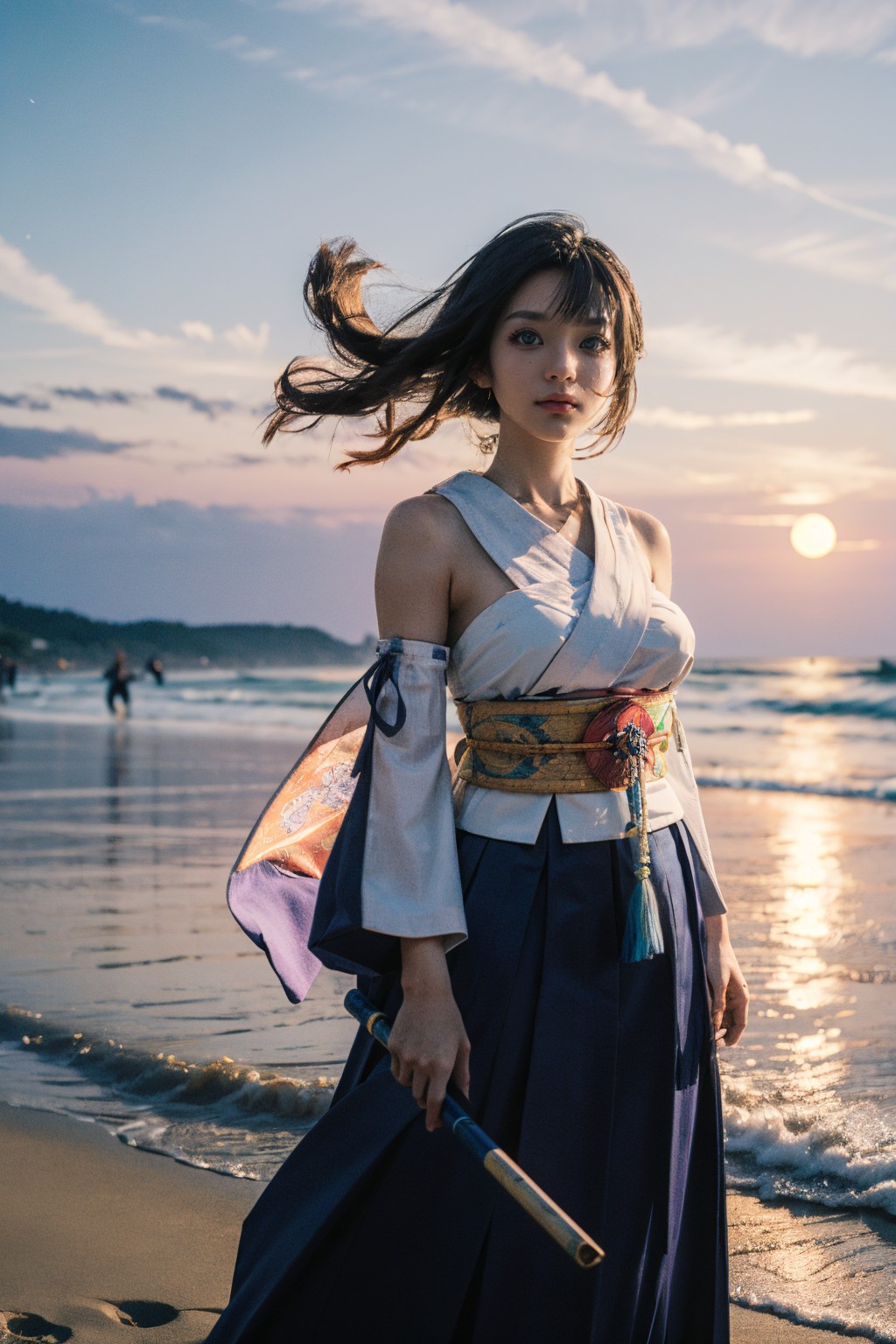 FF X,yuna,In the image, a young woman is the main subject. She is standing on a beach during sunset. The sun is setting behind her, casting a warm glow over the scene. The woman is dressed in traditional Japanese attire, which includes a blue and white kimono with a floral pattern. A red obi, a sash traditionally worn with kimonos, is tied around her waist. In her right hand, she holds a wooden fan. The beach on which she stands is sandy, and the ocean can be seen in the background. The sky above is clear, allowing for an unobstructed view of the sunset. There are no other people visible in the image. The womans position on the beach and her attire suggest that she might be participating in a cultural event or celebration related to traditional Japanese customs. There are no discernible texts in the image. The relative positions of the objects confirm that the woman is standing on the beach, with the ocean behind her and the sun setting beyond her. The image does not provide information about the actions of the objects, as they are inanimate. The image is a still life capturing a moment in time. This description is based solely on the visible content of the image, without any assumptions or interpretations beyond what can be confidently determined from the image itself.