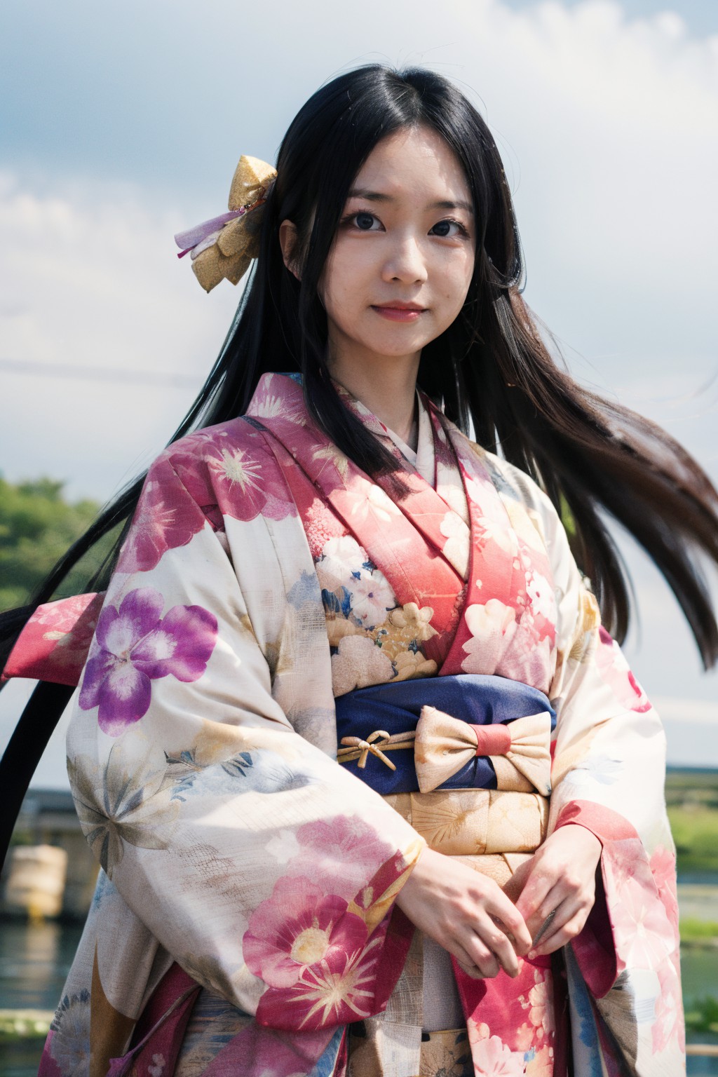 kimono uchikake hime,In the center of the image, a young woman is captured in mid-motion, walking along a serene riverbank. Shes adorned in a traditional Japanese kimono that blooms with colors of pink and white. The kimono is accentuated by a blue obi belt, its gold bow adding a touch of elegance.Her hair, long and black, cascades down her back, complementing the delicate pink flowers she wears as earrings. Her hand delicately supports her knee as she walks, suggesting a sense of grace and poise.The backdrop to this scene is a tranquil river, its surface calm and undisturbed. The riverbank extends into the distance, providing a natural frame for the image. The overall composition of the image suggests a peaceful day spent in nature, with the woman moving gracefully through her surroundings.