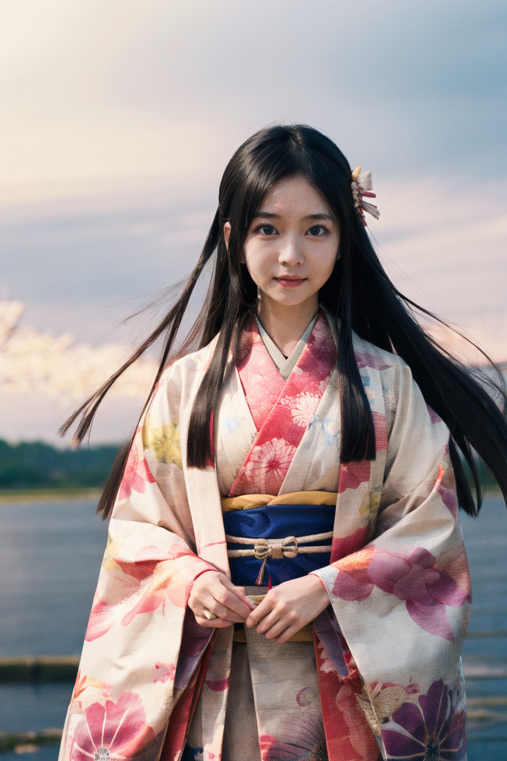 kimono uchikake hime,In the image, a young woman is captured in a moment of serene beauty. She stands on a pier that extends into a tranquil body of water, its calm surface reflecting the clear blue sky above. The womans attire is traditional Japanese, with a long black kimono adorned with a floral pattern of red and pink hues. A gold belt cinches her waist, adding a touch of elegance to her ensemble. Her hair is styled in an elegant updo, secured with a single, delicate flower.She holds a fan in her left hand, perhaps as a shield from the sun or simply as part of her attire. The pier she stands on serves as a perfect frame for this picturesque scene, leading the viewers eye towards the tranquil water body beyond.The image is devoid of any text or discernible actions by objects. Its a still capture of a moment frozen in time, with the woman appearing to be lost in thought. The relative positions of the objects are such that the woman is the central figure, with the pier and the body of water serving as the backdrop.This description is based on the visible elements in the image and does not include any speculative or imaginary content.