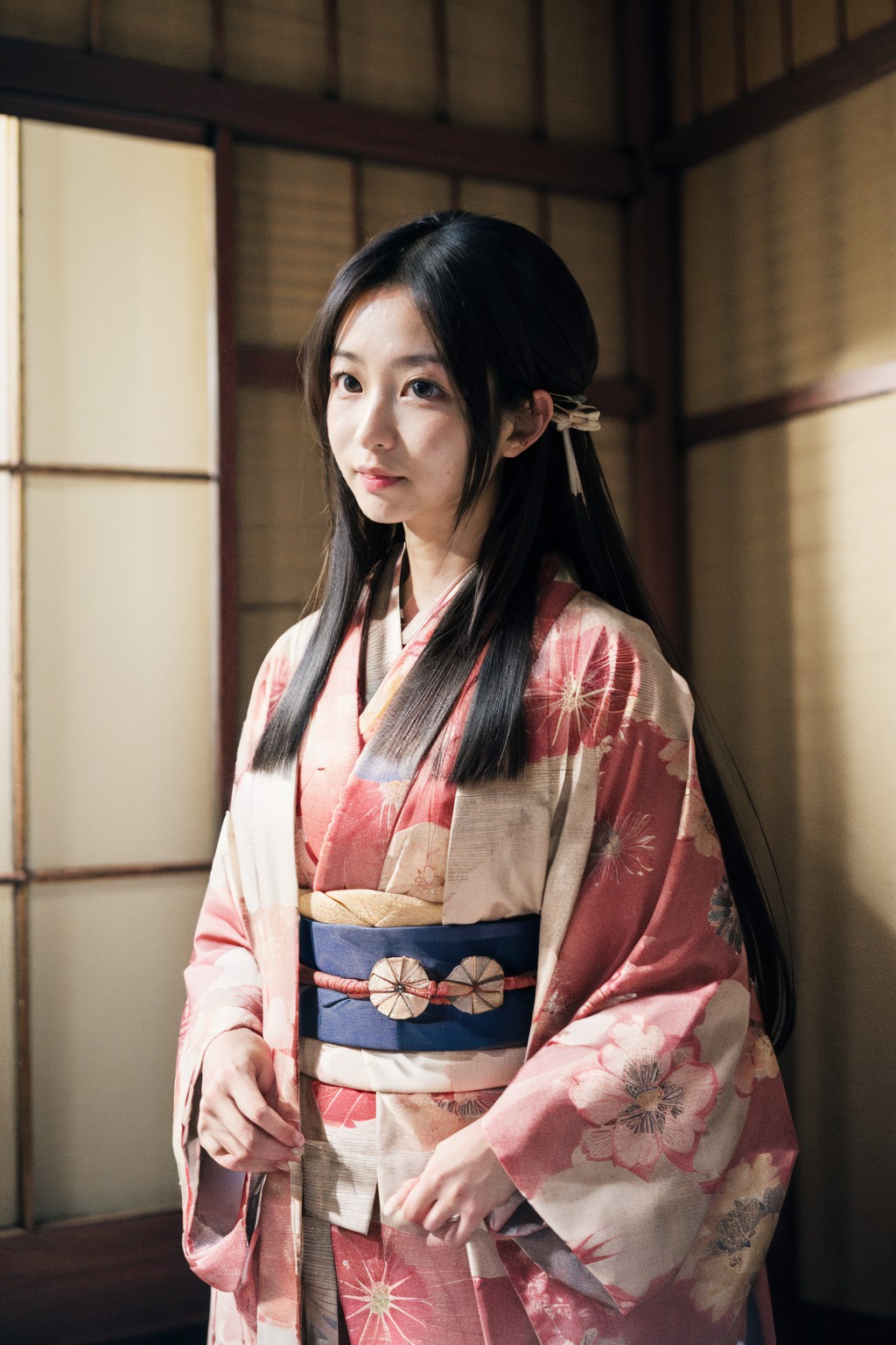 kimono uchikake hime,In the image, a woman is captured in traditional Japanese attire. She stands against a backdrop of wooden panels and a window with white blinds. Her black hair cascades down her back, contrasting with the pink kimono shes wearing. The kimono is adorned with intricate floral patterns and is cinched at the waist with a blue obi. In her hand, she holds a fan, its color mirroring that of her kimono. The image exudes an air of elegance and tradition.