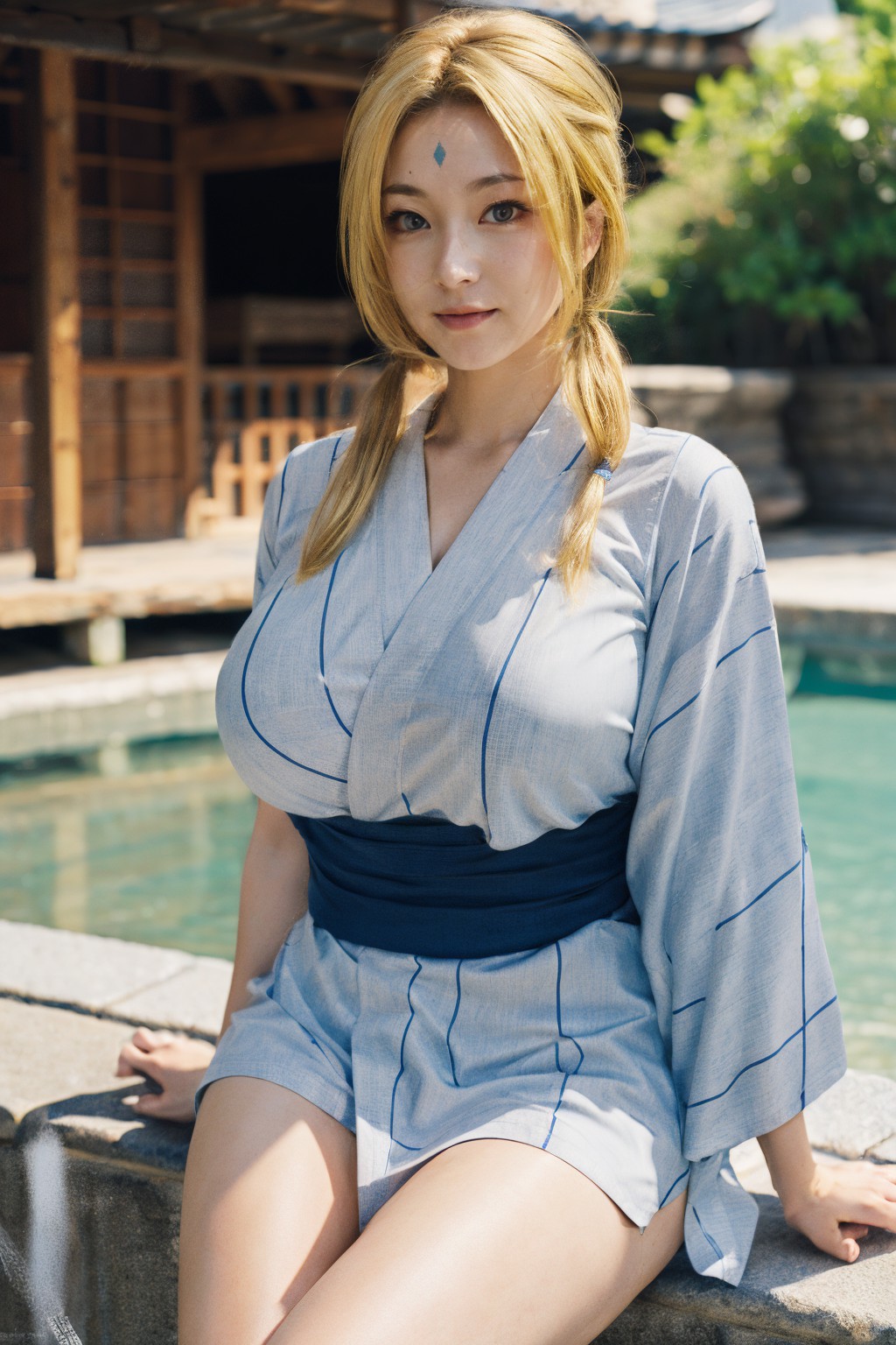Naruto,Tsunade,In the center of the image, a young woman with blonde hair is captured. Shes wearing a traditional Japanese kimono thats a blend of blue and white colors. The kimono is cinched at the waist with a black obi belt, adding a striking contrast to her attire.She is seated on a stone wall, which provides a rustic backdrop to the scene. Behind her, theres a wooden building, further enhancing the traditional aesthetic of the image.The womans gaze is directed towards the camera, and she carries a slight smile on her face. This could suggest that shes enjoying herself or perhaps posing for the photo.There are no discernible texts in the image. The relative positions of the objects confirm that the woman is in the foreground with the stone wall beneath her and the wooden building situated behind her. The overall composition of the image places emphasis on the woman, making her the focal point of the scene.