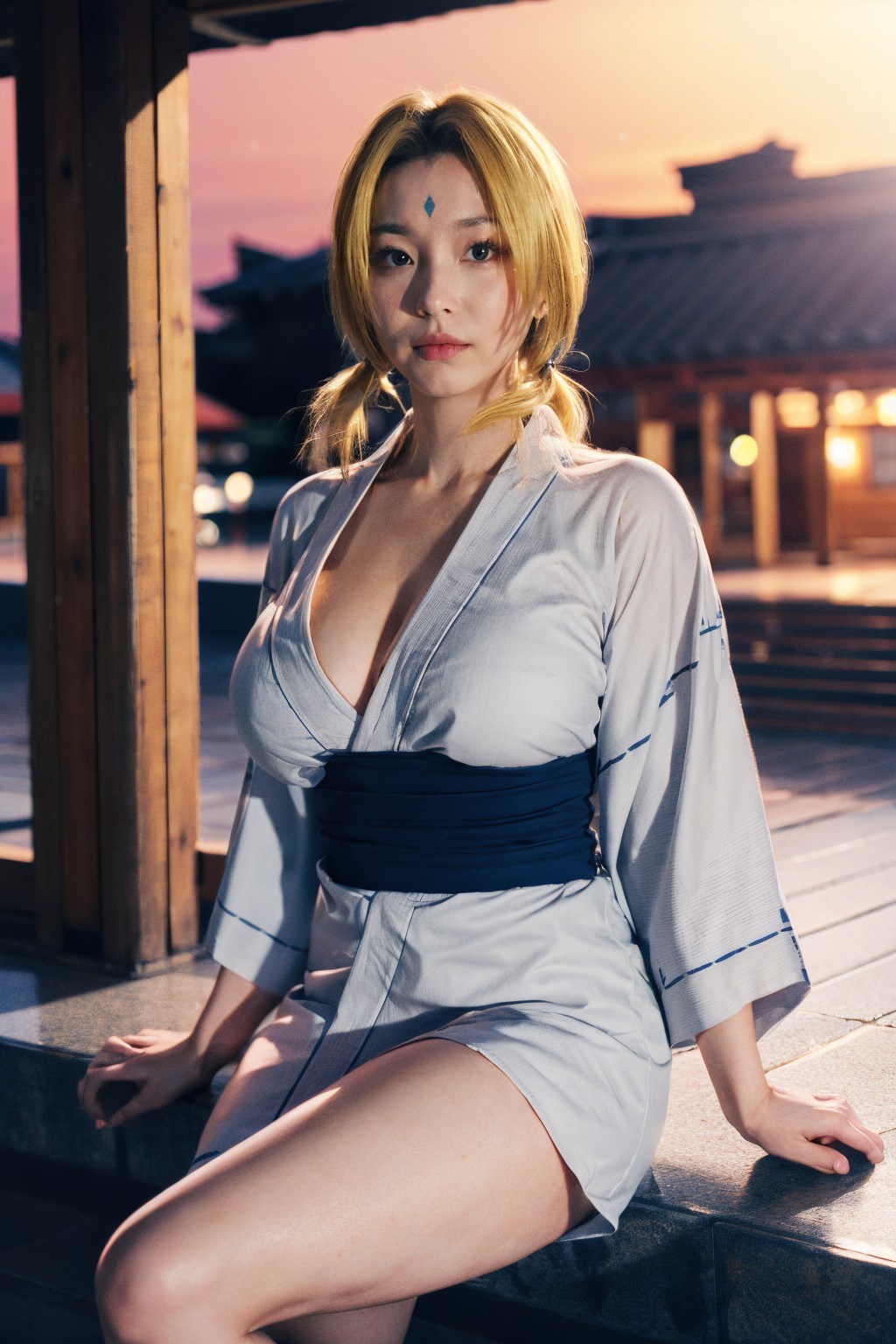 Naruto,Tsunade,In the image, a woman is captured in a moment of quiet reflection. Shes seated on a stone steps leading up to a traditional Korean temple, her body relaxed with one hand resting lightly on her knee. Her attire is simple yet elegant - a white hanbok cinched at the waist with a blue belt. A flower adorns her hair, adding a touch of color and symbolism to her ensemble. The setting sun paints the sky in hues of orange and pink, casting a warm glow over the scene. The temple behind her, constructed from wood, stands as a testament to Korean architecture and history.