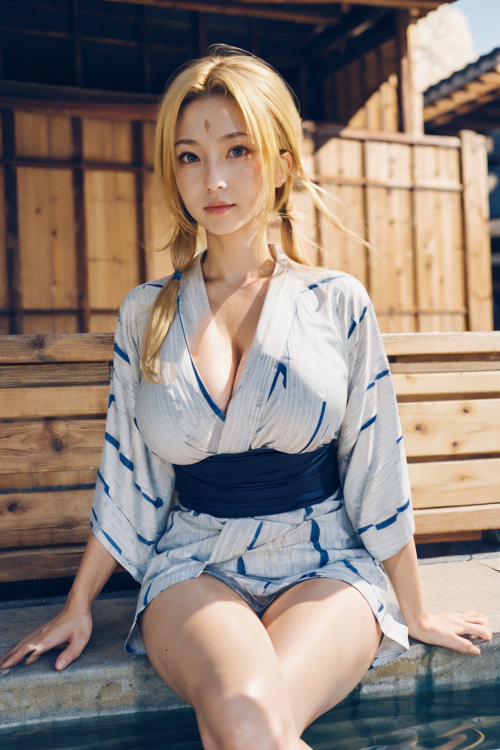 Naruto,Tsunade,In the image, a woman with blonde hair is captured in a moment of tranquility. She is seated on a wooden bench, her legs casually crossed and arms resting comfortably on the backrest of the bench. Her attire consists of a white kimono adorned with blue stripes, cinched at the waist with a black obi. The kimonos traditional design contrasts with the modern setting.The woman is positioned against the backdrop of a clear blue sky, suggesting an outdoor setting. A wooden fence can be seen in the background, adding to the rustic charm of the scene. The bench on which she sits appears sturdy and well-made, indicating its likely part of a public space or park.Despite the simplicity of the scene, theres a sense of harmony between the woman and her surroundings. The image captures a moment of quiet reflection, with no other people or significant objects in sight. Its as if time has paused for this woman, allowing her to enjoy the serenity of the day.