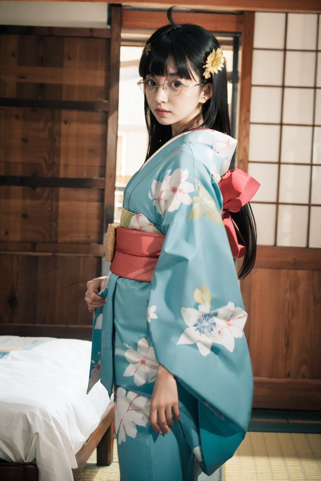 Araragi Tsukihi, Monogatari Series,In the image, a young woman is captured in a moment of serene contemplation. Shes adorned in traditional Japanese attire, specifically a blue kimono thats beautifully patterned with white flowers and a vibrant red obi around her waist. Her hair is neatly tied back with a gold hair clip, adding a touch of elegance to her ensemble.She stands in a room characterized by wooden walls and floors, lending an air of rustic charm to the scene. The woman is positioned near a window, through which one can glimpse a tranquil garden, further enhancing the peaceful ambiance of the setting.Her gaze is directed off to the side, suggesting shes lost in thought or perhaps observing something outside the frame. Her expression is serious, hinting at a moment of deep introspection or contemplation.The image doesnt contain any discernible text or additional objects. The focus is solely on the woman and her immediate surroundings, creating a harmonious blend of tradition, tranquility, and individual reflection.