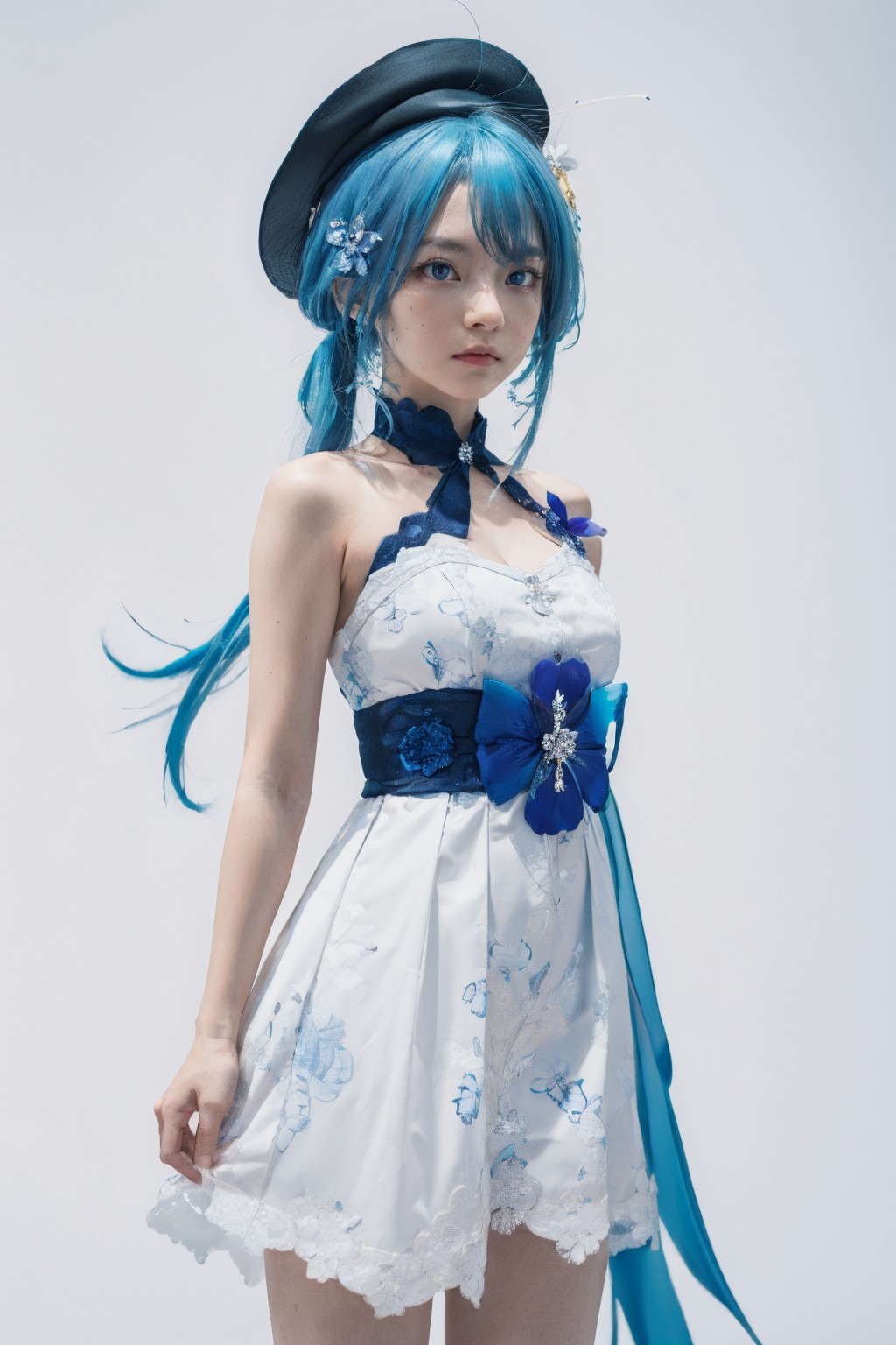 Griseo,Honka,The image portrays a young woman, who is the central figure of the composition. She has striking blue hair that falls around her shoulders, and shes wearing a black hat adorned with a single flower on the left side. Her outfit consists of a white dress decorated with blue flowers, paired with blue gloves that match the color scheme.In her hands, she holds a sword, suggesting a warrior or fighter theme. The woman is positioned in front of a gray background, which contrasts with the vibrant colors of her attire and accessories. She stands upright, facing the camera directly, with her gaze fixed on it, indicating a sense of confidence and readiness. There are no discernible texts or other objects in the image. The relative position of the woman and the sword suggests she is prepared for combat or action. The image does not provide additional context about the setting or purpose of the scene.