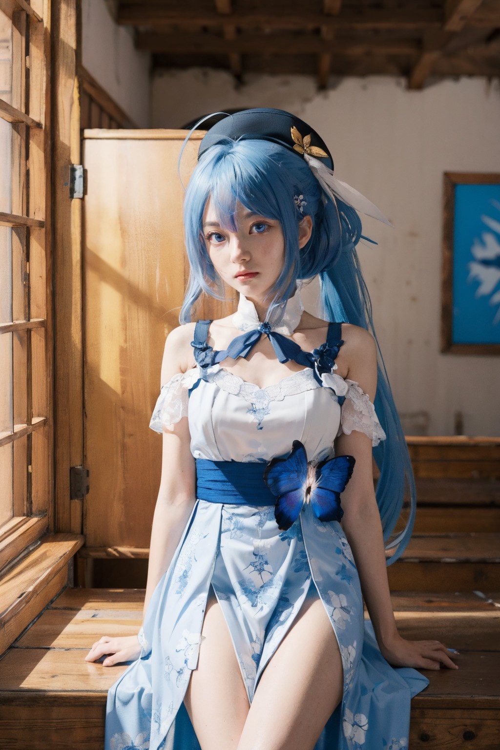 Griseo,Honka,In the image, a young woman with blue hair styled into two neat pigtails is captured. She is dressed in a white dress adorned with blue flowers, and she wears blue shorts underneath. Her gaze is directed off to the side, suggesting she might be lost in thought or observing something outside the frame.She stands in front of an open window, which offers a view of a wooden floor beyond. A blue curtain hangs from the window, matching her hair color and dress. The room behind her is simply furnished, with a wooden bench visible in the background, providing a contrast to the otherwise white walls.The womans position relative to the window suggests she might be about to step outside or has just returned indoors. Her attire and the overall setting create an atmosphere of calm and tranquility. The image does not contain any discernible text. The precise locations of the objects are as follows: the woman is centrally located, with the bench and wooden floor in the background behind her, and the window to her left.