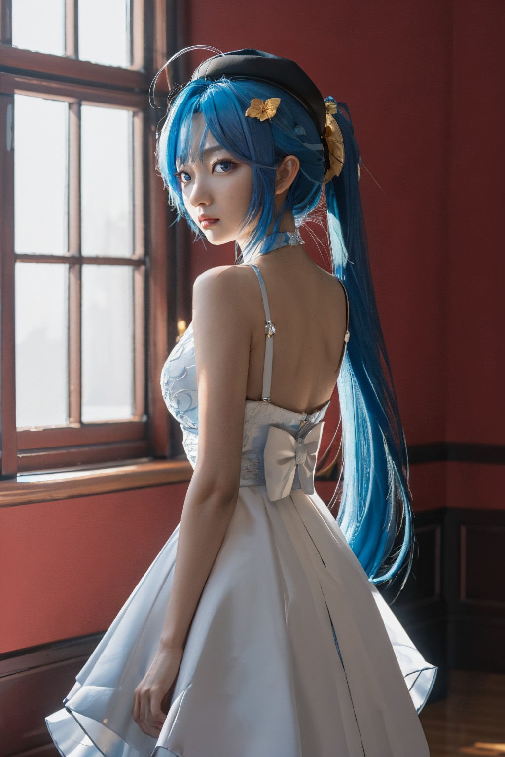 Griseo,Honka,In the image, a young girl with blue hair and bangs is captured. Shes standing in front of a red wall, her body angled towards the right side of the frame. Her attire consists of a white dress adorned with a bow on the back. The dress, simple yet elegant, contrasts beautifully with her vibrant blue hair. A black headband rests on her head, adding a touch of sophistication to her look. Shes looking off to the left, perhaps lost in thought or simply observing something outside the frame. In front of her, theres a white window. The window has multiple panes and is closed, suggesting it might be daytime. The red wall behind the girl and the white window create a striking color contrast, making the image visually appealing.There are no discernible texts or countable objects in the image. The relative positions of the objects are such that the girl is in front of both the wall and the window. The bow on her dress is on the back of it, and her hair is styled with bangs framing her face. This description is based solely on the visible content of the image, without any added imagination or aesthetic interpretation.
