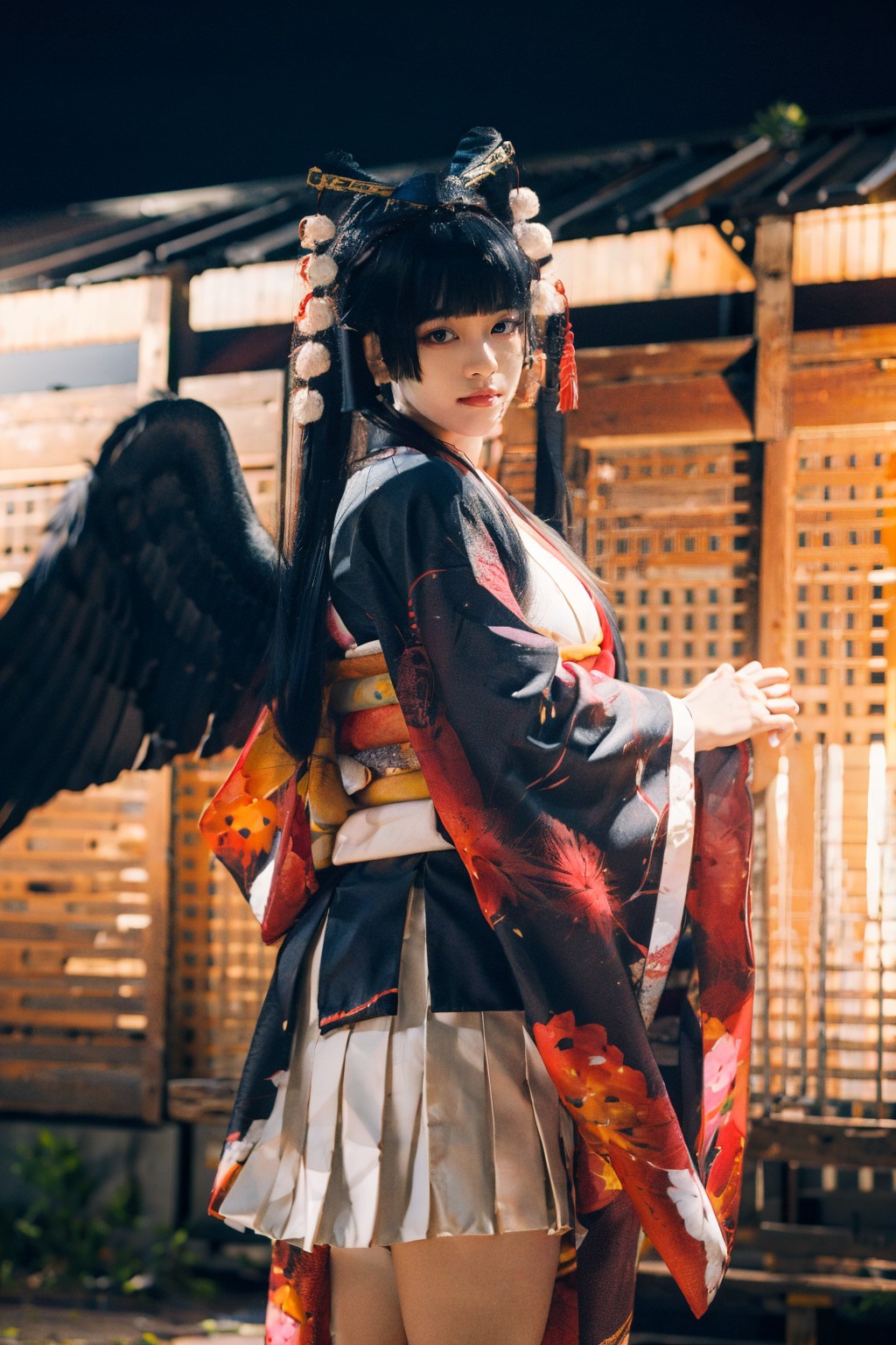 Nyotengu Traditional,Dead or Alive,In the heart of a serene garden, a young woman stands as the centerpiece of this image. She is adorned in traditional Japanese attire, her kimono bursting with color and vibrancy. The top half of her outfit is black, contrasted by a skirt that dances with hues of red and orange. Adding to her ensemble are two white feathers tucked into her hair, lending an air of elegance and grace.Her left hand gently holds onto the handle of a Japanese fan, known as a uchiwa, while her right hand rests lightly on her hip. Her gaze is directed off to the side, a slight smile playing on her lips - perhaps shes lost in thought or simply enjoying the tranquility of her surroundings.The garden behind her is lush with greenery, wooden fences standing tall and adding an element of rustic charm. The entire scene paints a picture of peace and serenity, a moment frozen in time where tradition meets nature.