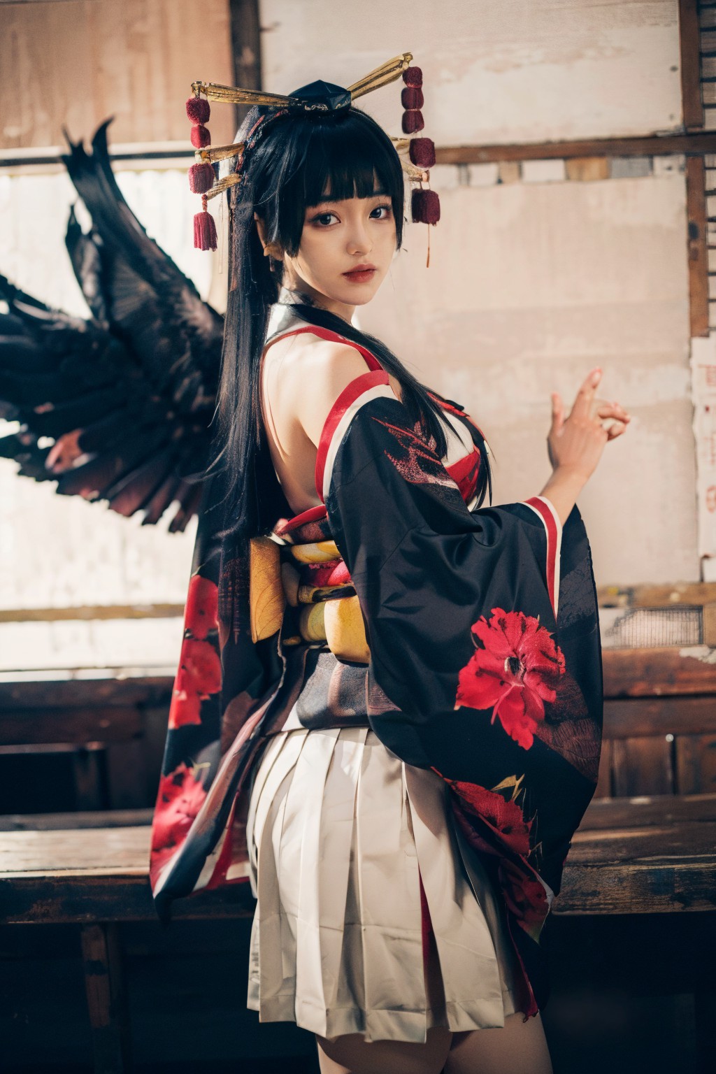Nyotengu Traditional,Dead or Alive,In the image, a woman is captured in a moment of quiet contemplation. She stands against a backdrop of a wooden wall with windows and a window sill, adding a rustic charm to the scene. The woman is adorned in traditional Japanese attire, specifically a black kimono decorated with red flowers, a symbol often associated with power, strength, and resilience. The kimono is paired with a white blouse underneath, creating a striking contrast against the dark fabric of the kimono. Around her neck rests an intricately designed headdress, characterized by its gold and red hues. This traditional headwear accentuates her status and authority.A pair of wings are attached to her back, a common symbol in Japanese culture representing power and protection. The wings appear to be made of paper, adding a unique element to her ensemble.The womans left hand is gracefully raised towards the window sill, as if she is about to take a seat or perhaps is simply enjoying a moment of peace. Her gaze is directed off to the side, suggesting that her attention has been captured by something outside of the frame, sparking curiosity and inviting further interpretation.Overall, the image presents a serene scene that combines elements of traditional Japanese culture with subtle hints of modernity, creating a captivating visual narrative.