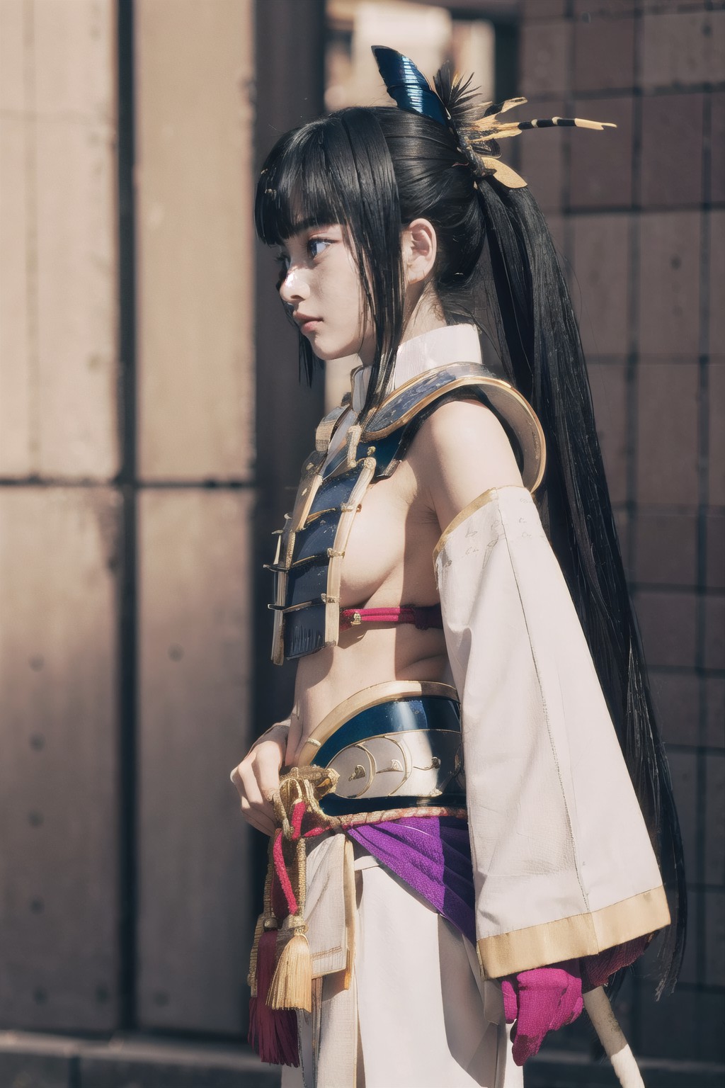 Ushiwakamaru,Fate Grand Order,In the center of the image, a cosplayer dressed as Mewtwo from the Pok矇mon franchise is captured. The cosplayer is standing against a backdrop of a building with a red brick wall and a white pillar. The cosplayers costume is a striking combination of colors. They are wearing a blue and gold armor that covers their upper body, complete with a chest plate. A red sash is draped over their waist, adding to the colorful ensemble. Their hair is styled into two large black pigtails, complementing the overall look.The cosplayers stance is dynamic and full of character. They are holding onto their sword hilt, which is located on their right side. Their gaze is directed off to the side, suggesting a sense of focus or concentration. Despite being in character, the cosplayer maintains a serious expression, further enhancing the authenticity of the Mewtwo cosplay.The image does not contain any discernible text. The relative positions of the objects suggest that the cosplayer is the main subject of the image, with the building serving as a backdrop to highlight their costume and pose. The image is rich in detail, providing a comprehensive view of the cosplayers Mewtwo cosplay.