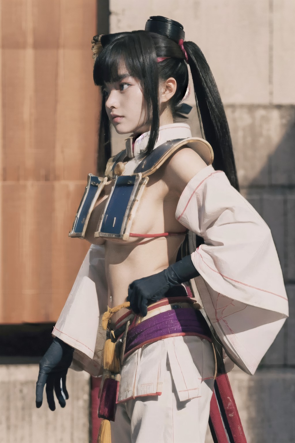 Ushiwakamaru,Fate Grand Order,The image captures a moment of tranquility featuring a young woman adorned in traditional Japanese attire. Her hair, as black as the night sky, is elegantly styled into two high buns on either side of her head. The buns are accentuated by a striking red bow, adding a touch of color to her ensemble.Her dress, a pristine white garment with accents of purple and gold, drapes her figure in a display of artistry and culture. The kimono she wears is meticulously crafted, each detail contributing to its overall aesthetic appeal.She stands against the backdrop of a gray wall, upon which hangs a wooden panel, adding an element of rustic charm to the scene. Her gaze is directed to the left, her expression serious as if lost in thought or perhaps engaged in a solemn moment.The image, in its entirety, paints a picture of elegance and tradition, capturing not just the physical attributes of the woman but also hinting at the cultural significance of her attire.