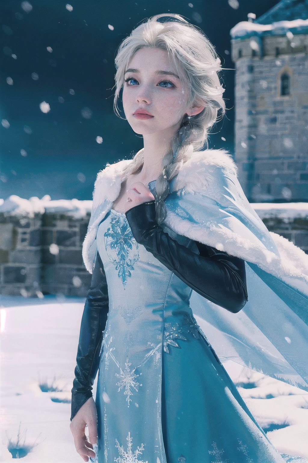 Elsa de Frozen,In the image, we see actress Isla Fisher, known for her role as Anna Manni, standing on a snowy landscape. She is adorned in a blue cape and gown, embellished with white snowflakes, adding to the wintry theme. In her hand, she holds a black glove, possibly a symbol or tool of significance to her character. Her gaze is directed off into the distance, suggesting a sense of contemplation or concern. The backdrop features a stone castle, further enhancing the chilly ambiance of the scene. The image does not contain any discernible text.