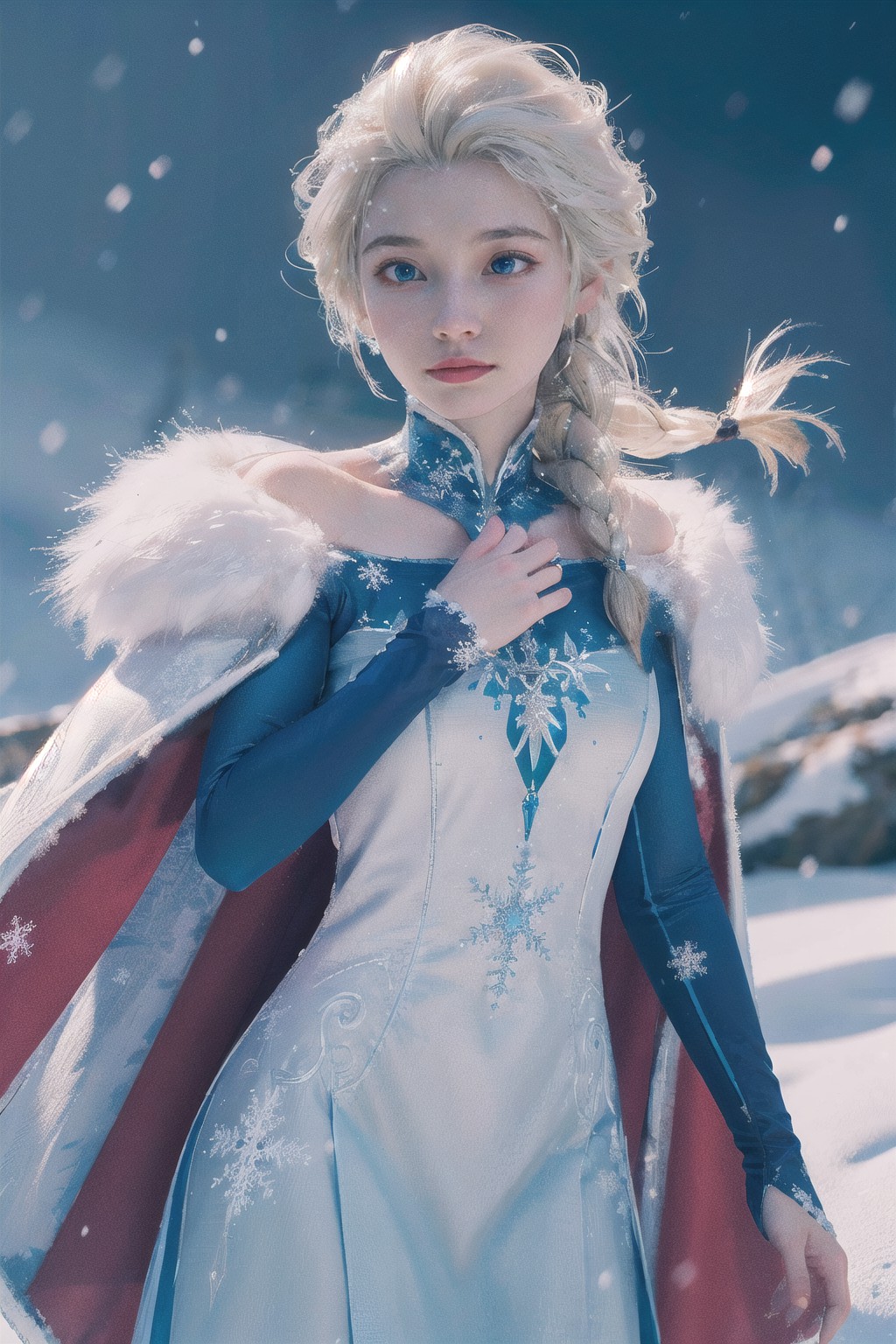 Elsa de Frozen,In the image, a young woman is standing amidst a snowy landscape. She is adorned in a striking blue and white dress that contrasts beautifully with the surrounding snowflakes. The dress features long sleeves and a high collar, adding an element of elegance to her attire.Her blonde hair flows down her shoulders, catching the light as it falls around her face. On her back, she wears a white fur cape that adds a touch of luxury to her ensemble. In her hand, she holds a blue sash with a golden clasp, which glints in the cold light.The womans gaze is directed off to the side, and her expression is serious, as if lost in thought or perhaps contemplating something profound. The backdrop of the image is a serene winter scene, with snowflakes gently falling around her, adding to the overall tranquility of the moment.Every element in this image comes together to create a captivating portrait of a young woman in a winter landscape, exuding an air of elegance and mystery.