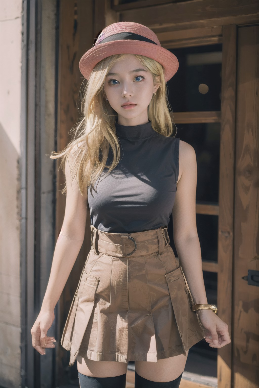 Serena, Pokemon,In the center of the image, a young woman stands confidently with her hands placed on her hips. She is positioned slightly to the left of a wooden door that serves as the backdrop for this scene. The woman is dressed in a black dress and skirt ensemble, which contrasts sharply with her pink hat adorned with a white flower. Her long blonde hair cascades down, adding a touch of elegance to her outfit.The setting appears to be outdoors, as suggested by the blurred background that hints at trees and foliage. Despite the blur, the natural elements provide a serene ambiance to the image. The womans attire, combined with her poised stance, suggests she is ready for an event or outing. However, no specific details about the event or her identity are discernible from the image. There is no text present in the image. The relative positions of the objects and the woman indicate that she is the main subject of this image, with the wooden door serving as a secondary element in the composition.