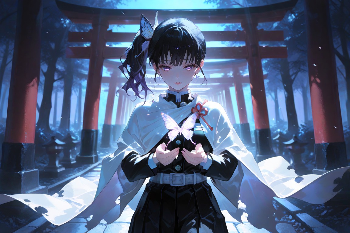Tsuyuri Kanao,In the heart of a serene forest, a young girl stands poised and ready. Her black hair is adorned with a blue ribbon that matches her eyes, reflecting a sense of tranquility. She is dressed in a white kimono, its simplicity contrasting with the vibrant red of her sleeves and headband. The headband is embellished with a pink rose, adding a touch of delicacy to her attire.In her hands, she holds two butterflies, their wings spread wide as if ready to take flight at any moment. Her gaze is fixed on them, perhaps contemplating the beauty and fragility of life. Behind her, towering over the forest floor, are red torii gates. These traditional Japanese gateways add an element of mystique to the scene, suggesting that this could be a place of worship or a sacred site.The background is shrouded in darkness, allowing the girl and the butterfly she holds to stand out prominently. The blue tint on the image further enhances this effect, casting everything else into soft shadows and drawing focus to the girl and her butterfly companions. This image captures a moment frozen in time, where natures beauty meets human elegance, creating a scene that is both captivating and poignant.
