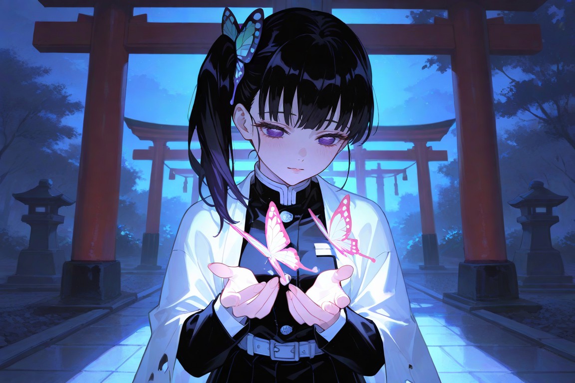 Tsuyuri Kanao,In the center of a serene night scene, a young woman with black hair adorned with blue highlights stands out. She is dressed in a white kimono, and her attire is completed with a matching black obi belt around her waist. In her hands, she delicately holds a butterfly-shaped charm, which glows softly against her dark clothing.Behind her, the scene opens up to reveal a tranquil garden. A wooden archway forms a natural gateway in the background, leading the eye towards an array of red torii gates. These traditional Japanese gates are a symbol of the transition from the mundane to the sacred.The entire image is bathed in a cool blue tint, lending it an ethereal and dreamlike quality. Its as if time has paused for this moment, allowing us to appreciate the beauty of the scene. The woman, the butterfly charm, the archway, and the torii gates all come together to create a harmonious composition that speaks volumes about the tranquility and elegance of Japanese culture.