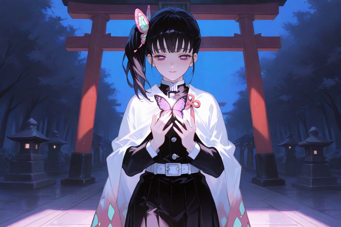 Tsuyuri Kanao,In the image, a young woman with black hair is standing under a red torii gate. She is holding a pink butterfly-shaped charm in her right hand and a white cat figurine in her left hand. Her attire consists of a black and white dress, accessorized with a red bowtie. The setting appears to be a forest with trees and lanterns in the background. The womans position under the torii gate suggests she is at the entrance of a sacred or special place. The butterfly charm and cat figurine she holds could indicate her interests or beliefs. The overall image gives a sense of tranquility and reverence.
