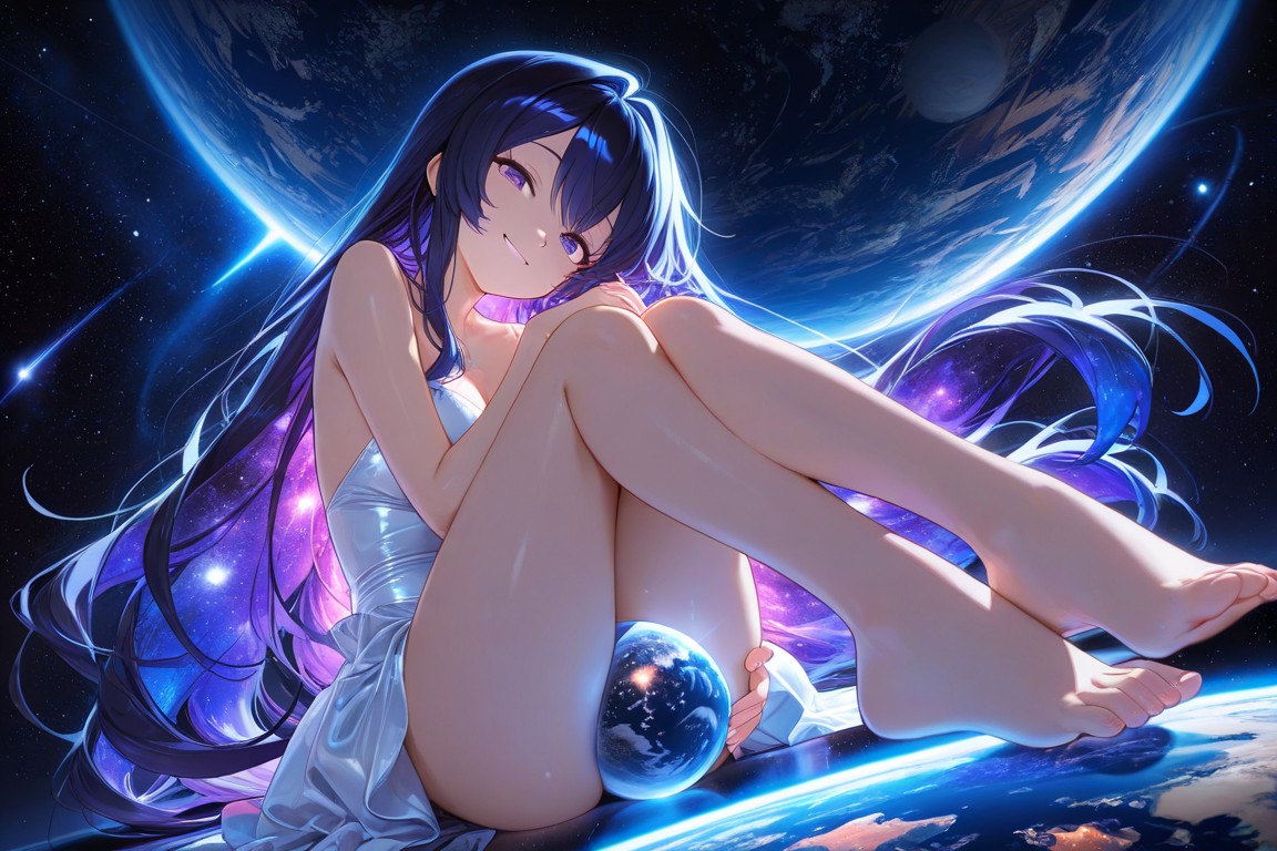 Mother of the Planet,In the image, a young woman with black hair is seated on a blue planet. She is dressed in a white dress that contrasts with her dark hair. Her gaze is directed upwards, towards the purple galaxy and moon visible in the top left corner of the image. The planet shes sitting on is adorned with blue flowers, adding a touch of nature to the cosmic setting. The entire scene paints a picture of tranquility and wonder.