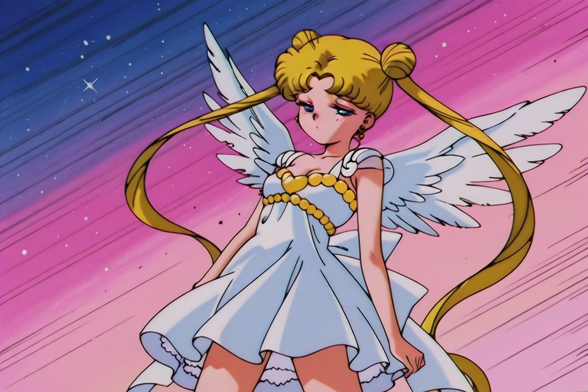 Sailor Moon Usagi Tsukino,In the center of a backdrop that transitions from blue at the top to pink and yellow at the bottom, stands a cartoon girl with blonde hair. Her hair is adorned with two large bows on either side, adding a touch of charm to her appearance. Shes dressed in a white dress that features gold accents, giving it a playful yet elegant look.Her arms are extended to her sides as if shes about to take flight. In fact, she does have wings attached to her back, suggesting that she might be an angel or perhaps a fairy. The wings seem ready for action, echoing the anticipation in her posture.Adding to her ethereal appearance is a halo that encircles her head. It too shares the same gold accents as her dress, creating a harmonious color scheme throughout her outfit. The halo not only sets her apart but also signifies her importance or status within this setting.Overall, the image captures a moment of anticipation and enchantment, with the cartoon girl poised in a fantastical world brought to life through vibrant colors and detailed design elements.