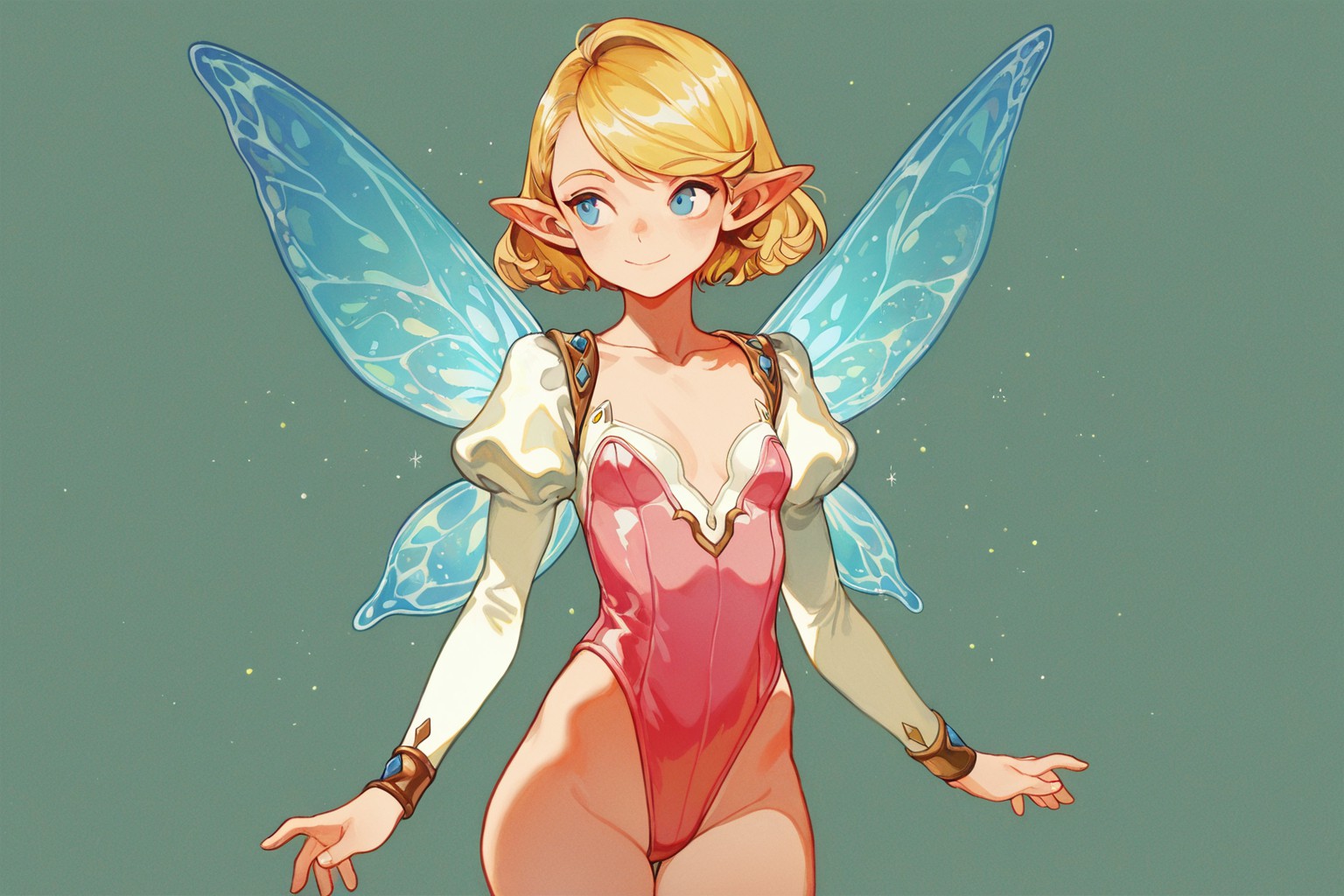 fairy girl,In the center of the image, a young woman with blonde hair is captured. She has a pair of blue wings sprouting from her back, adding an element of fantasy to the scene. Her attire consists of a pink bodysuit adorned with gold accents, and she holds a brown object in her right hand. All these elements are set against a backdrop that transitions smoothly from green at the top to blue at the bottom, providing a vibrant contrast to the womans features.