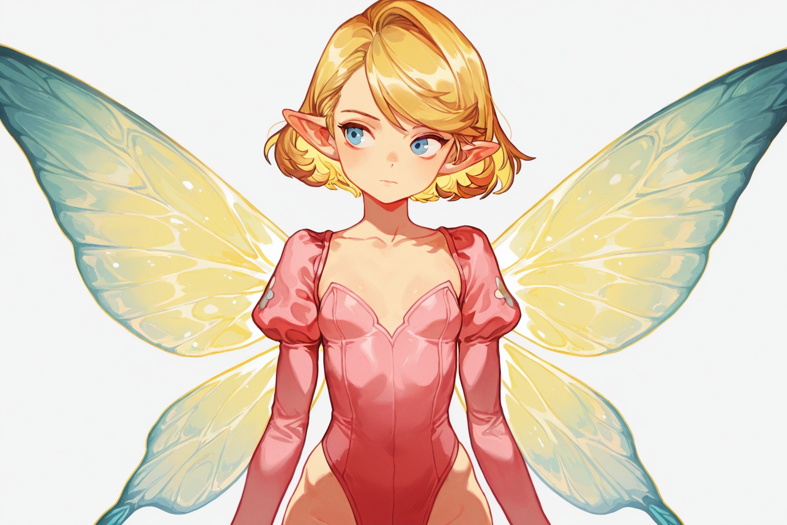 fairy girl,In the center of a white background, a young girl with blonde hair and blue eyes is standing. Shes wearing a pink dress that extends to her knees and matching pink wings sprout from her back. The wings are large and extend outwards from either side of her body. Her gaze is directed straight at the viewer, creating a sense of direct engagement. Theres no text or other objects in the image. The girl appears stationary with no indication of movement. The relative position of the girl to the background suggests shes standing upright. The simplicity of the image focuses all attention on the girl and her pink dress-wings ensemble.