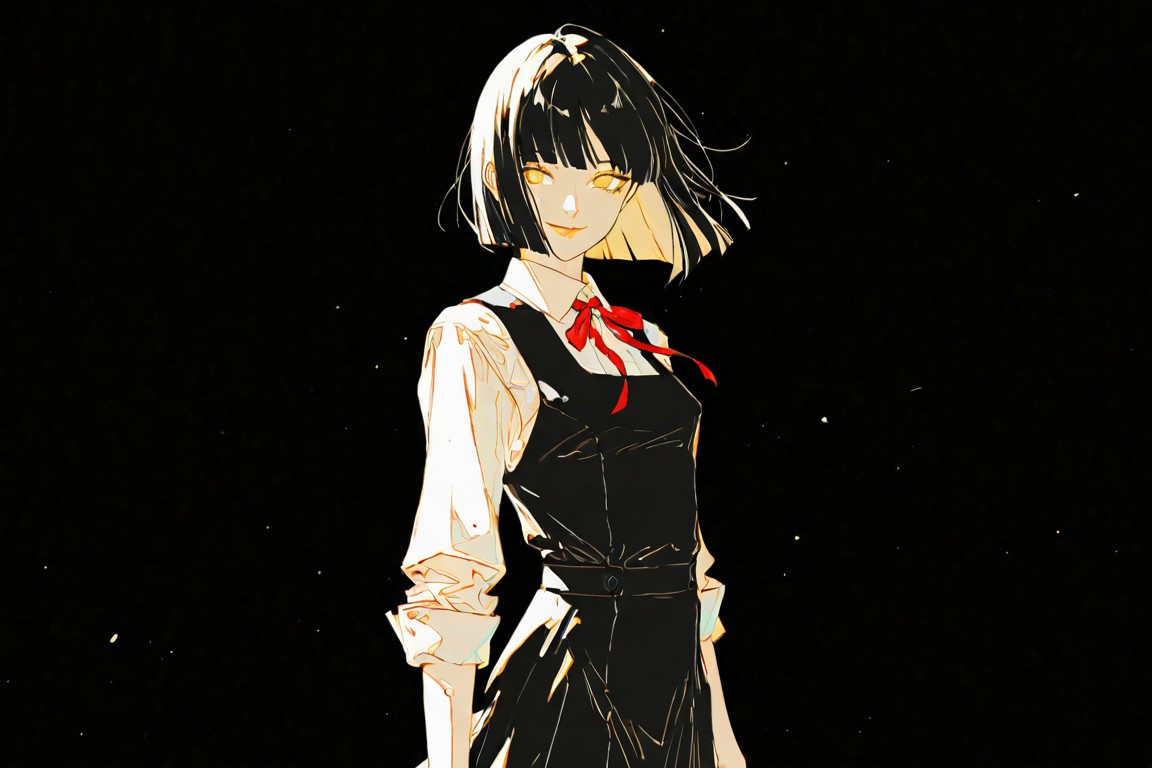 Japanese JK silhouette,In the image, a young woman with black hair is the central figure. She is dressed in a black dress that contrasts against her fair skin. Adding a pop of color to her outfit is a red bow tied around her neck. The woman stands firmly on the ground, which is depicted as dark gray, suggesting an indoor setting or perhaps night.Her gaze is directed downwards and slightly to the right, creating a sense of contemplation or introspection. Despite being in black and white, the image is rich with detail. The womans hair flows freely around her shoulders, adding a dynamic element to the otherwise static scene. There are no discernible texts or other objects in the image.The relative positions of the objects are such that the woman is at the forefront, while the ground forms the backdrop. Her position on the ground and her downward gaze suggest she might be deep in thought or perhaps lost in a moment of quiet reflection. The image does not provide any additional context or background information about the woman or her surroundings. Its a simple yet powerful portrait, focusing solely on the woman and her expressions.