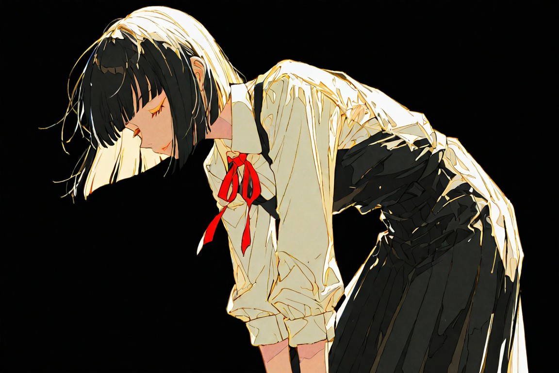 Japanese JK silhouette,In the center of a black background, a woman is captured in a moment of quiet reflection. Shes dressed in a white blouse adorned with yellow stripes and a red bow, paired with a black skirt that adds a touch of elegance to her attire. Her hair, styled in loose waves, cascades down her shoulders, complementing the overall serene ambiance of the image.Her gaze is directed downwards, lost in thought as she seems engrossed in something on the ground. The precise location of this object isnt discernible from the image, but its clear that it has captured her attention. Despite being an illustration, the womans expression and posture are lifelike, almost as if she were a real person standing there, lost in thought.The image doesnt contain any text or other objects, focusing solely on the woman and her introspective moment. The simplicity of the background further accentuates the woman and her actions, making it a powerful piece of art that tells a story without words.