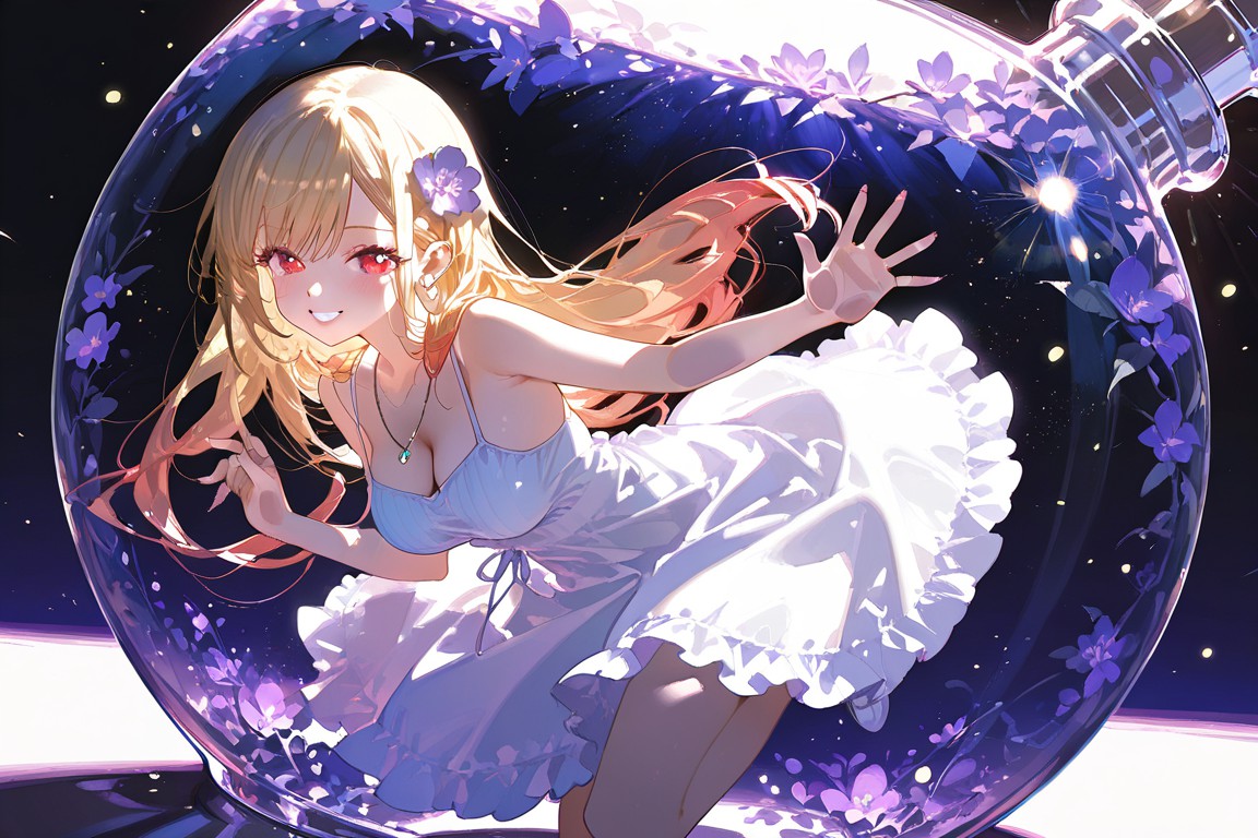 kitagawa marin,In the center of the image, a young girl with long blonde hair is seen inside a clear glass bottle. The bottle, adorned with purple flowers and topped with a silver cap, is filled to the brim with water that has a purple hue, possibly indicating that its a representation of a sea or ocean scene. The girl, dressed in a blue dress with white ruffles on the skirt, has her arms stretched out to either side as if shes embracing the vastness of the sea. Her hair is styled in loose waves that cascade down her shoulders, adding to the overall ethereal quality of the image.The background is dark and textured, likely suggesting a night sky or underwater scene. Scattered throughout this backdrop are small blue lights, possibly representing stars or fish swimming in the deep blue sea. The image does not contain any discernible text. The relative positions of the objects suggest that the girl is at the bottom of the bottle, surrounded by water and flowers. The blue lights are scattered around her, creating a starry effect in the otherwise dark background. The silver cap of the bottle is located at the top, while the girls head is positioned towards the middle of the bottle, indicating that she is inside it.This detailed description is based on the visible content of the image and does not include any assumptions or interpretations beyond what can be confidently determined from the image itself.