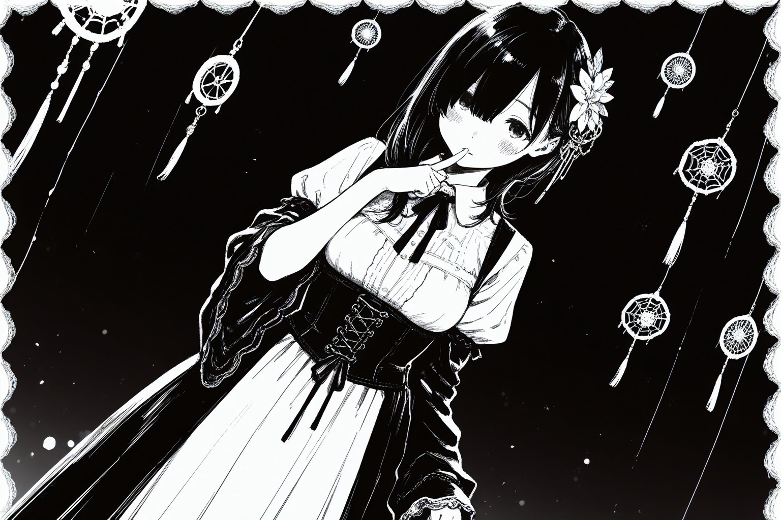 napata yoshiron eightman kotoyama,The image portrays a striking black and white illustration of a young woman, who is the central figure. She is adorned in a white dress that is embellished with black lace trimmings, adding a touch of elegance to her attire. On her head, she wears a flower crown, lending a sense of nature-inspired charm to her appearance.Her hair is styled in a side-swept manner, which complements the overall simplicity of the illustration. She gazes off to the side, her face imbued with a serene expression that adds depth to the image.The background is dark and filled with numerous stars and dreamcatchers, creating an ethereal ambiance that envelops the woman. The dreamcatchers are particularly intriguing as they hang down like chandeliers, their presence enhancing the mystical theme of the illustration.Despite being in black and white, the image is rich in detail and narrative, each element playing a part in creating a captivating visual story.