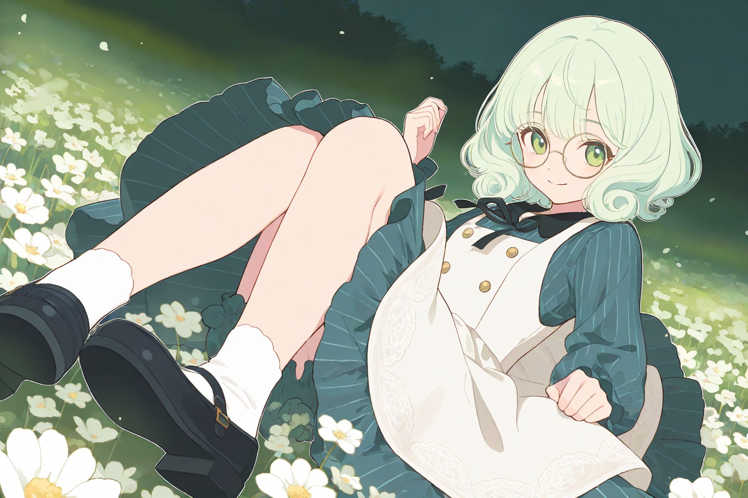 A beautiful dream on the green grass,In the image, a young girl with blonde hair and green eyes is the main subject. Shes lying on her stomach on a bed of daisies that are white with yellow centers. The girl is dressed in a blue and white striped dress, adding a touch of color to the scene. On her feet, shes wearing black shoes adorned with gold buckles.The background of the image is dark blue and filled with black and white stripes, providing a stark contrast to the vibrant colors of the foreground. Adding an element of fantasy to the scene, there are flying daisies scattered throughout the background. The girls position on the bed of daisies, combined with her relaxed posture and the whimsical elements in the background, creates an atmosphere that is both peaceful and dreamlike. Theres no text present in the image. The relative positions of the objects suggest a carefully arranged scene, possibly for artistic or storytelling purposes.