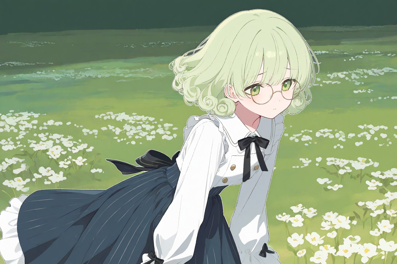 A beautiful dream on the green grass,In the image, a young girl with vibrant green hair and glasses is the central figure. Shes dressed in a white blouse paired with a blue skirt, adding a pop of color to her outfit. Her gaze is directed downwards, suggesting a sense of deep thought or contemplation.The setting is a field dotted with small white flowers, providing a serene backdrop to the scene. The girl stands amidst these flowers, further emphasizing her connection with nature.Despite the simplicity of the elements in the image, it conveys a certain atmosphere. Its as if the girl is taking a moment to herself in this tranquil setting, perhaps lost in her thoughts or simply enjoying the beauty around her. The image doesnt contain any text or additional objects, focusing solely on the girl and her surroundings.The relative positions of the objects are also noteworthy. The girl is standing in the foreground, with the field of flowers stretching out behind her. This arrangement places the viewers attention directly on the girl while still allowing for an appreciation of the natural scenery around her.