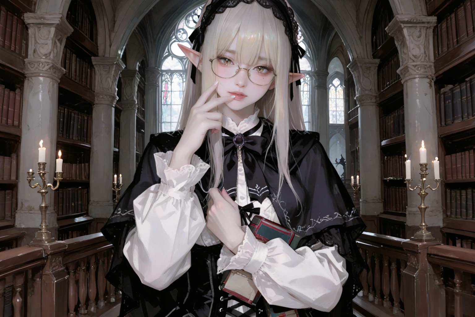 The Shadow of the Church,In the image, a young woman is the central figure, standing in front of an ornate bookshelf. She is dressed in a black outfit adorned with white polka dots, and shes holding a red book in her hand. Her hair is styled into a side-swept updo, and shes wearing glasses that add to her sophisticated look.The background features a large stained glass window, which casts a colorful light onto the scene. The bookshelf behind her is filled with numerous books, suggesting a setting of knowledge or study. On either side of the woman are two candlesticks, their flames flickering in the dimly lit room.Every object and person in this image is stationary, creating a serene atmosphere. The relative positions of the objects suggest that the woman is the focal point of this scene, with everything else serving as a backdrop to her presence. Theres no text visible in the image. This detailed description provides an accurate representation of the image content.