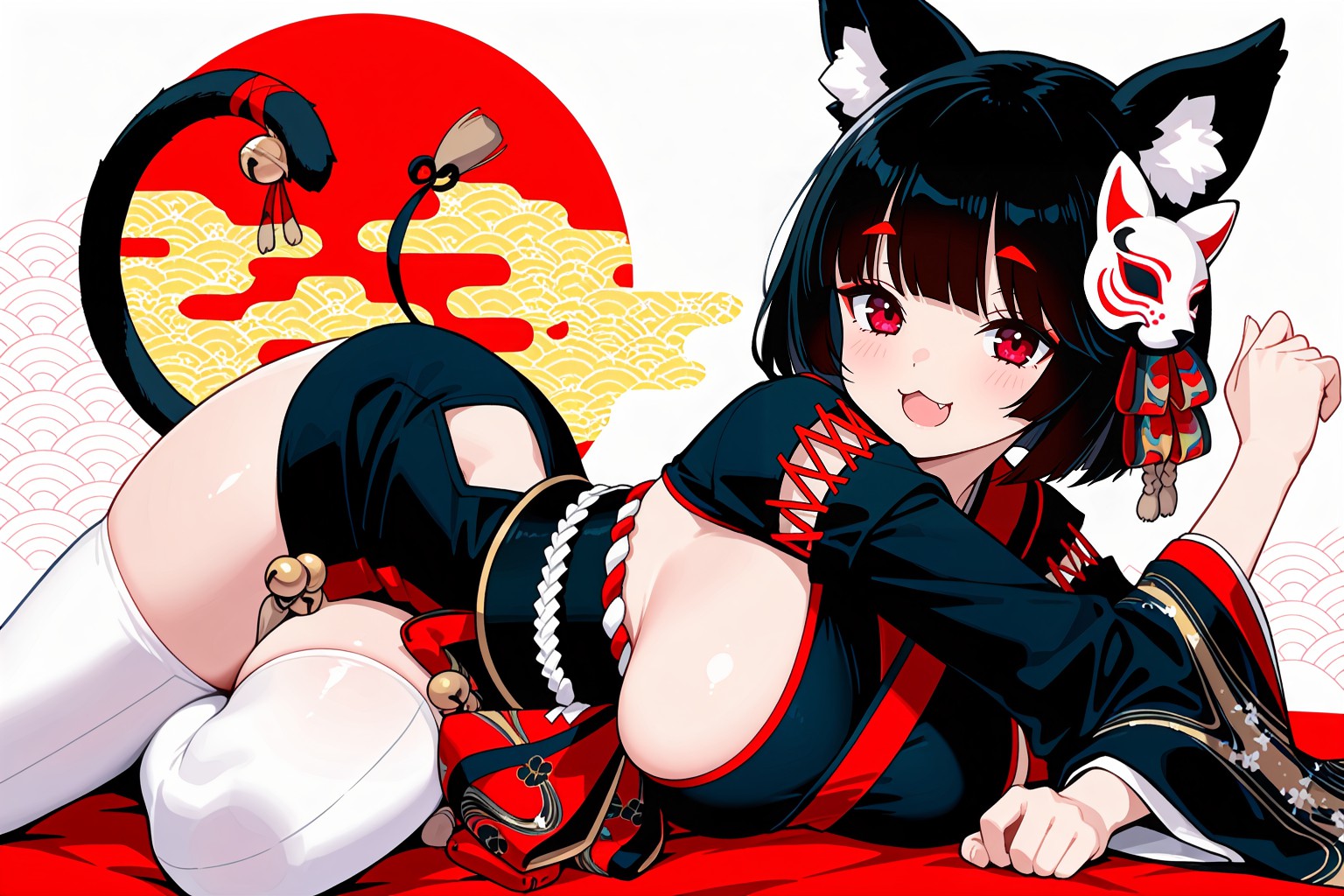 yamashiro azur lane,In the center of the image, a young girl with black hair is lying on her stomach on a red carpet. Shes dressed in a striking black and white outfit adorned with red accents. Her body is oriented towards the right side of the image, but shes looking over her shoulder at the camera, giving us a glimpse of her face.Behind her, theres a cat-like creature with red ears and paws. Its facing the left side of the image, its attention seemingly directed away from the girl. The backdrop is dominated by a large orange circle that contrasts vividly against a black background speckled with small white dots.Adding to the overall theme, there are Japanese characters on the right side of the image. Their text, ?? translates to cat and 蝝? which is the color red in Japanese. These elements together create an intriguing visual narrative that blends the realms of fantasy and reality.