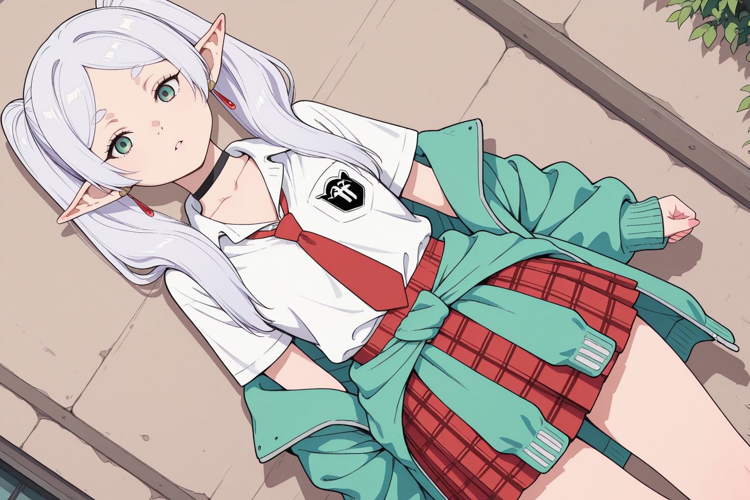 Frilian Urban Fantasy,In the center of the image, a young girl is lying on her stomach on a wooden floor. Her hair, styled into two pigtails with silver clips, adds a touch of innocence to her appearance. Shes wearing a white school uniform, which contrasts with her red plaid skirt and green jacket that she has tied around her waist. The girl appears to be in a relaxed state, with her arms resting comfortably on the floor beneath her.In the top right corner of the image, theres an additional view of the same scene, providing a different perspective of the girl and her surroundings. This repetition emphasizes the girl as the central focus of the image.Theres no text present in the image, and the relative positions of the objects remain constant - the girl on the floor, the wooden planks beneath her, and the additional view in the corner. The image captures a quiet moment, with the girl at rest and no actions taking place. The colors are vibrant, from the silver clips in her hair to the red of her skirt and the green of her jacket, all contributing to a lively scene.