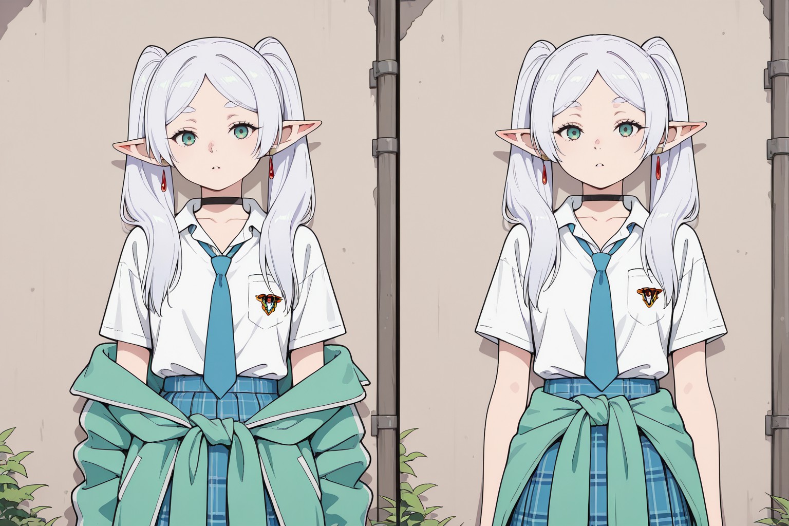 Frilian Urban Fantasy,The image presents a digital illustration featuring two female characters. They are standing side by side against a backdrop of a beige wall, with a window subtly visible on the left.Both characters are dressed in matching outfits that consist of a white blouse and blue skirt. The blouse is adorned with a gold emblem on the left chest area, adding a touch of elegance to their attire. Complementing the outfit are red hair clips, one each on the left and right sides of their head, providing a pop of color against their white hair.The image does not contain any discernible text or additional objects. The relative positions of the characters and their surroundings remain constant, with both characters centrally positioned within the frame of the illustration. The window on the wall is located to the left of the image, framing the scene subtly. The overall composition of the image suggests a sense of harmony and balance between the elements present.