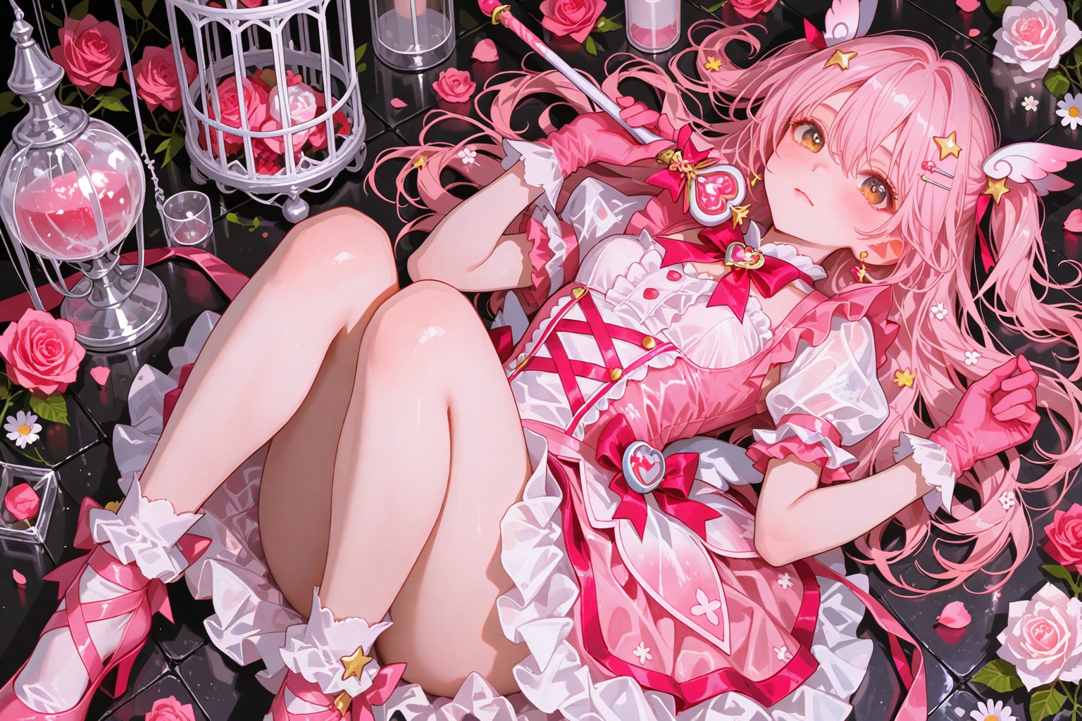 Magical Girl Flower,In the center of the image, a young girl with vibrant pink hair is peacefully sleeping on her stomach. Shes dressed in a charming pink dress adorned with red hearts, and shes wearing matching pink shoes that match her hair. Her arms are casually resting behind her head, suggesting a deep slumber.The girl is not alone; shes surrounded by an array of objects scattered around her. There are numerous glass vases and bottles, each filled with water and roses in hues of pink and white. The colors of the flowers echo the girls dress, creating a harmonious color palette.The entire scene is set against a stark black background, which serves to highlight the pink elements even more. The contrast between the black background and the colorful objects around the sleeping girl creates a striking visual effect. Despite the numerous objects, the focus remains on the sleeping girl, making her the undeniable star of this image.