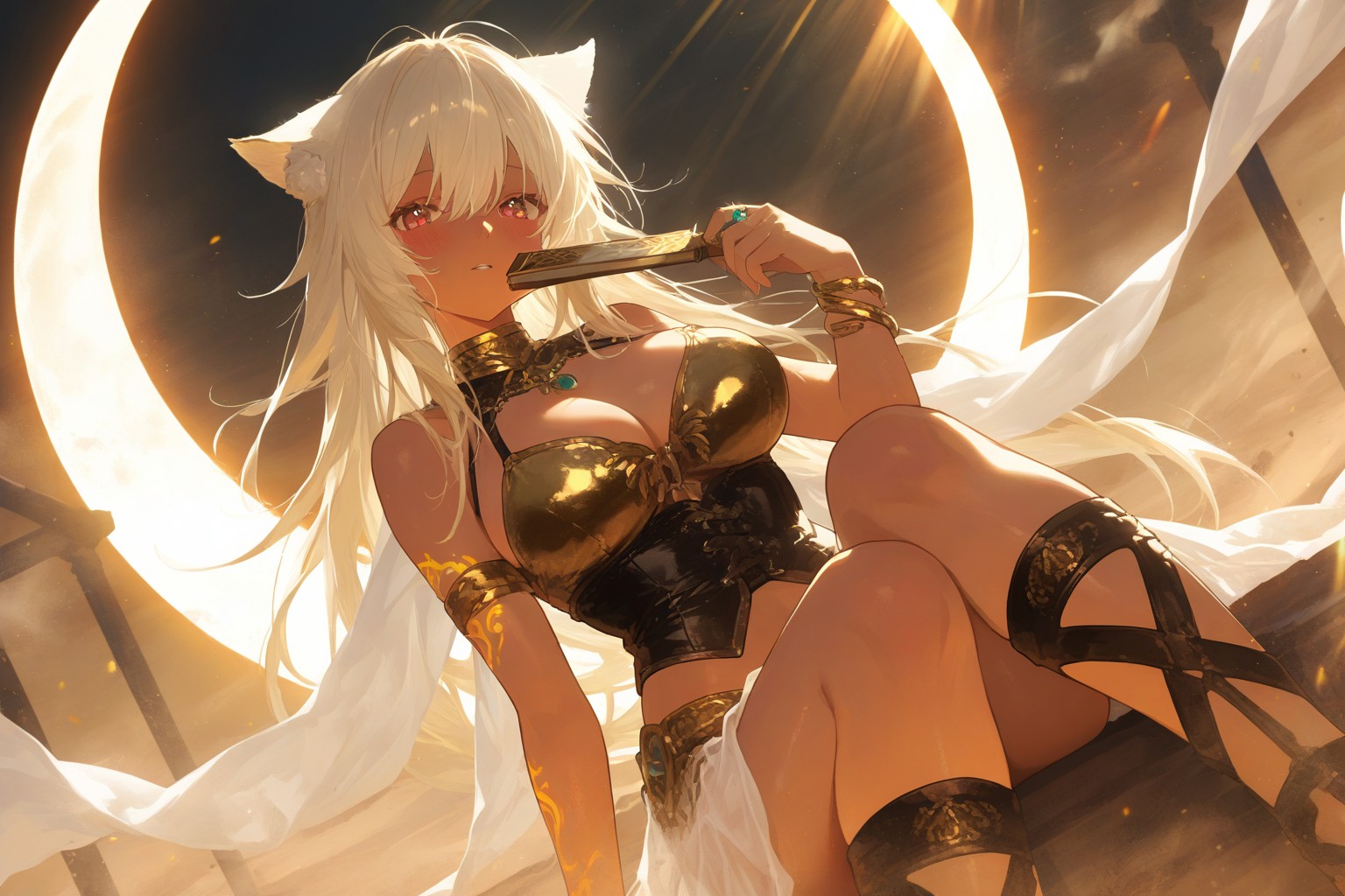 Desert mirage,The image portrays a scene from an animated film. The central figure is a female character, who is adorned with white fur. She has striking blue eyes that stand out against her fair complexion. Her attire consists of a black and gold bra, adding a touch of elegance to her appearance.She holds in her hand a golden key, a symbol often associated with unlocking doors or gaining access to new places. Her pose suggests she is either about to enter or exit a building, as indicated by the large archway that forms part of the background.The setting is quite dramatic, featuring a full moon that casts a soft glow over the scene. The sky above is painted in shades of orange and yellow, suggesting either an early morning or late evening time.In the bottom right corner of the image, theres a text overlay that reads sa_16007, which could possibly be a reference to the production code or file name associated with this image. However, without additional context, its difficult to determine its exact meaning. Overall, the image captures a moment of anticipation and adventure, as the character stands poised in front of an archway under a vibrant sky.